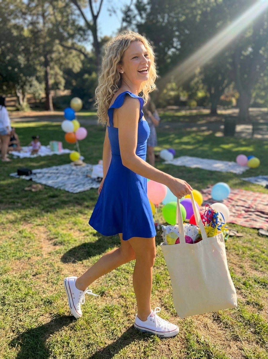This ‘Playful Preppy Picnic’ look, totaling $162.95, features the Picnic Perfect gingham sundress, priced at $60, as its vibrant cornerstone. The cobalt blue A-line mini dress with subtle ruffles on the shoulders provides a cheerful, youthful base. Its lightweight fabric is ideal for a daytime birthday or casual gathering, promising comfort without sacrificing style. Paired with classic white sneakers, this outfit offers a refreshing blend of casual and chic, perfectly suited for a sunny outdoor celebration.