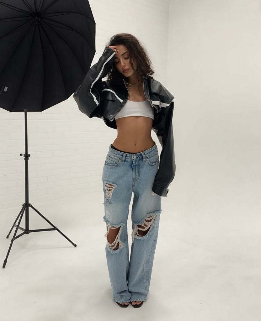 There’s a raw kind of beauty in this look—it feels like someone who dances between grunge and glam, without ever trying too hard. The ripped jeans scream carefree confidence, while the cropped leather jacket adds just the right amount of edge. It’s the kind of outfit you’d imagine Drew Barrymore rocking on a downtown rooftop in ’98, but here it is, revamped for 2026 with all the attitude still intact.