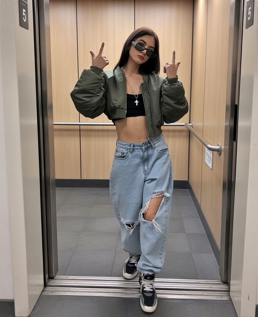 This one’s a whole Friends-style moment with a serious grunge upgrade. The boxy green bomber, the tiny crop, the dark shades—it all pulls together into a vibe that feels half rebellious teen and half fashion editor off-duty. And don’t even get me started on the jeans: baggy, ripped, and brimming with attitude.