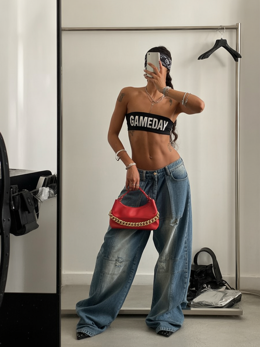 She’s ready to cheer, pose, or steal the whole show. This Rani Mukerji-meets-streetwear moment blends nostalgia with attitude. The bandeau top stamped with “GAMEDAY,” oversized denim, and that fierce pop of red in the bag? It’s giving fashion MVP. From the low-slung jeans to the glint of silver jewelry, everything says, “I came to win.”