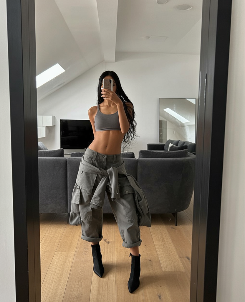 She’s giving warrior princess energy—tough, grounded, and still totally glam. The cargo-on-cargo layering, complete with rolled hems and sleek black boots, feels like utility wear met a runway and said, “Let’s dance.” The monochrome palette and long hair bring a mysterious softness that keeps the whole thing wearable and aesthetic.