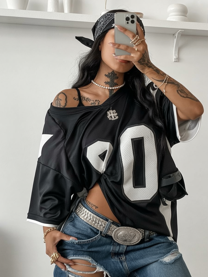 This look is a whole vibe; imagine Thalia at a block party in 96 with a new remix playing in the background. The oversized jersey, off one shoulder, layered with pearls and a bold belt, just oozes that unapologetic Freaknik energy. The tattoos and rings say, “Don’t mess,” but the pearls say, “I might.” \end{quote} It is perfect for women who love mixing masculine streetwear with feminine touches. It works best on medium or curvy builds, where the drape of the jersey creates a soft contrast to the fitted jeans. Go wild with the accessories; this is one of those iconic fits where more is more, especially if you’re heading to a day party or concert. \end{quote}