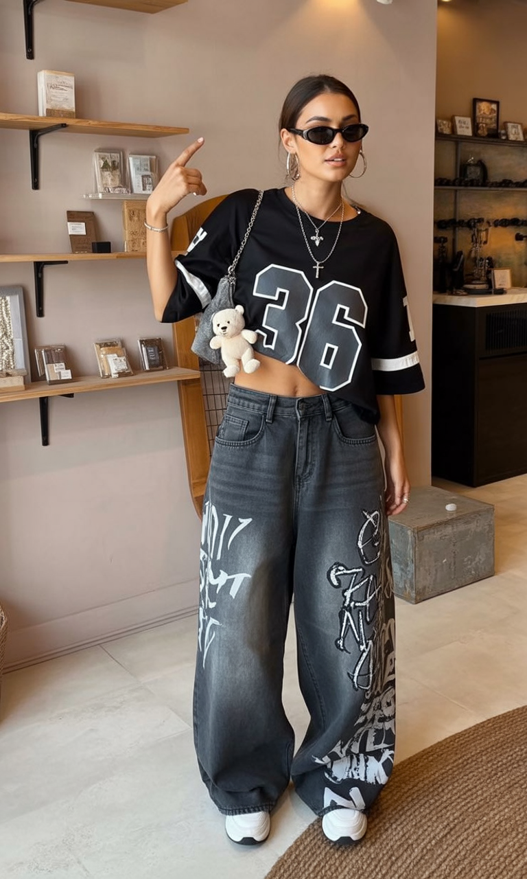 This is streetwear with a paintbrush—literal art on denim. The graphic black-and-white pants paired with a cropped football tee bring major grunge-meets-sports-bar energy. Add the shades and silver details, and suddenly you’re ready to headline a style blog.