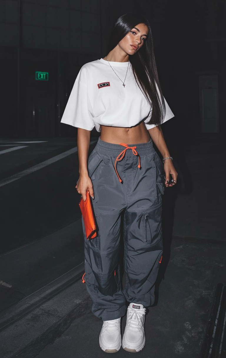 Minimalist doesn’t mean boring—this look is proof. The oversized white tee paired with charcoal utility pants brings a sleek and edgy twist to casual dressing. But it’s that pop of neon orange—in the drawstrings and clutch—that gives it a fresh, unexpected punch.