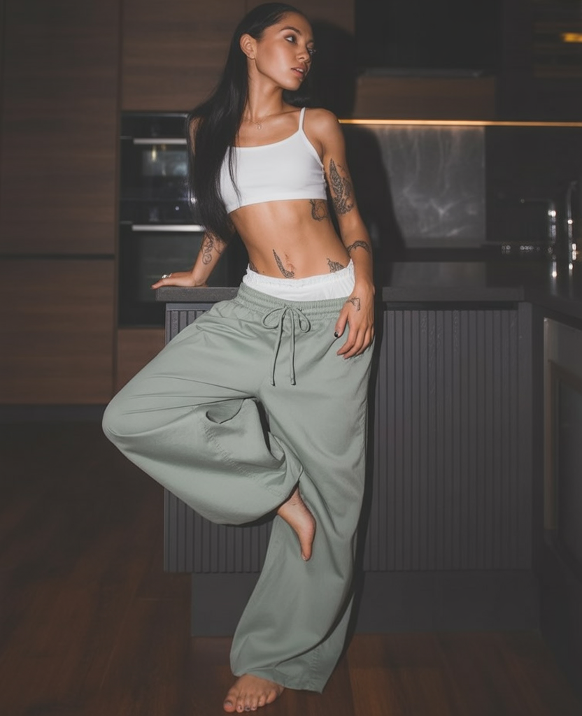 This outfit whispers cool confidence—that perfect mix of laid-back and alluring. The wide-legged sage sweats paired with a crisp white crop top look like something you’d wear while vibing to 90s R&B at midnight in your kitchen. It’s soft, slightly moody, and totally comfortable without losing an ounce of edge.