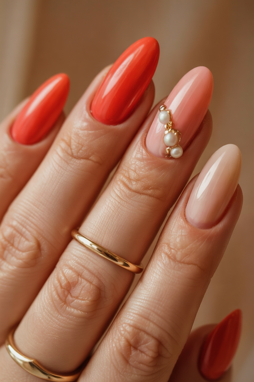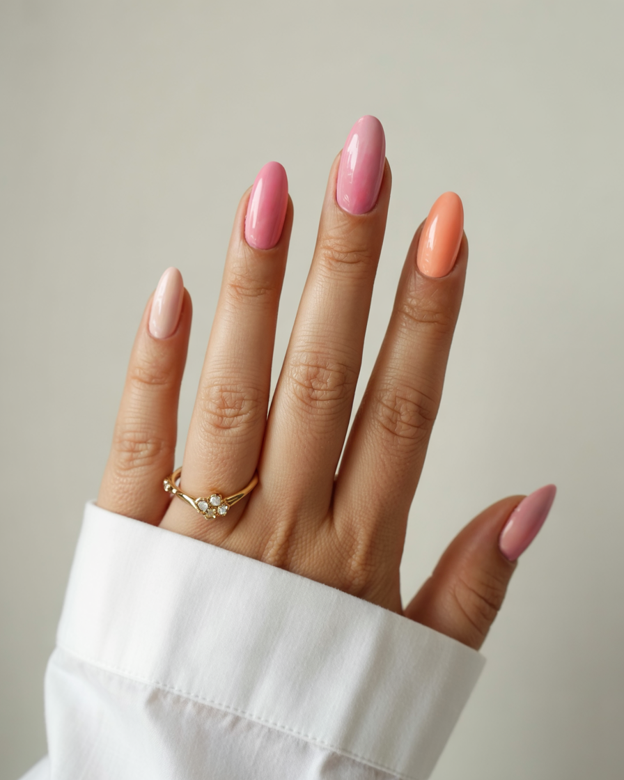 This look has an energetic, modern feel that still stays tasteful. The soft peach base melting into bright coral tips creates movement and personality, like a confident smile you can’t ignore. It feels fresh, uplifting, and perfectly suited to warmer days.