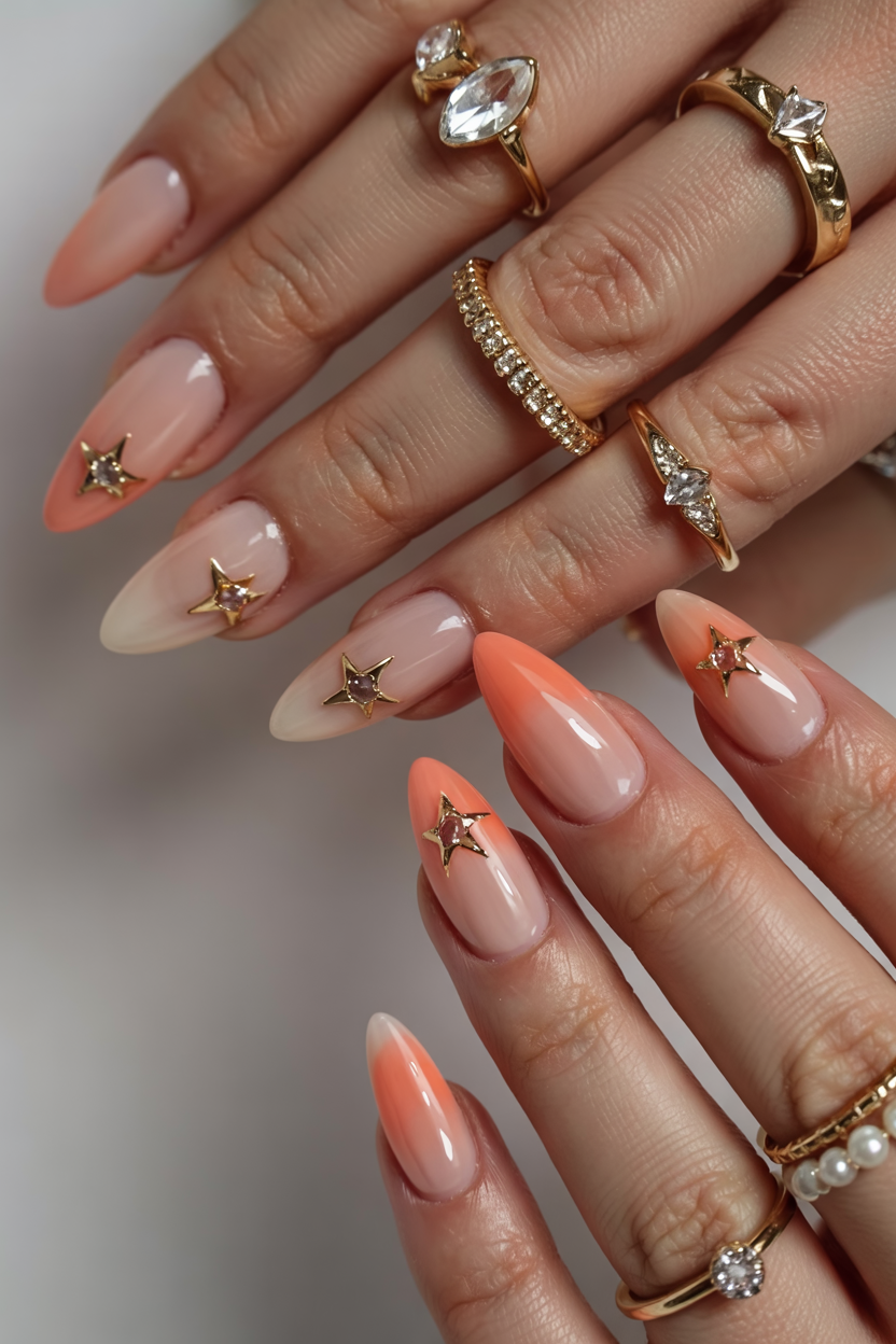 This manicure has a playful, dreamy edge while staying soft and elegant. The peach and nude base keeps things gentle, while the tiny star accents add personality and charm. It feels whimsical without being juvenile, like a quiet nod to creativity.