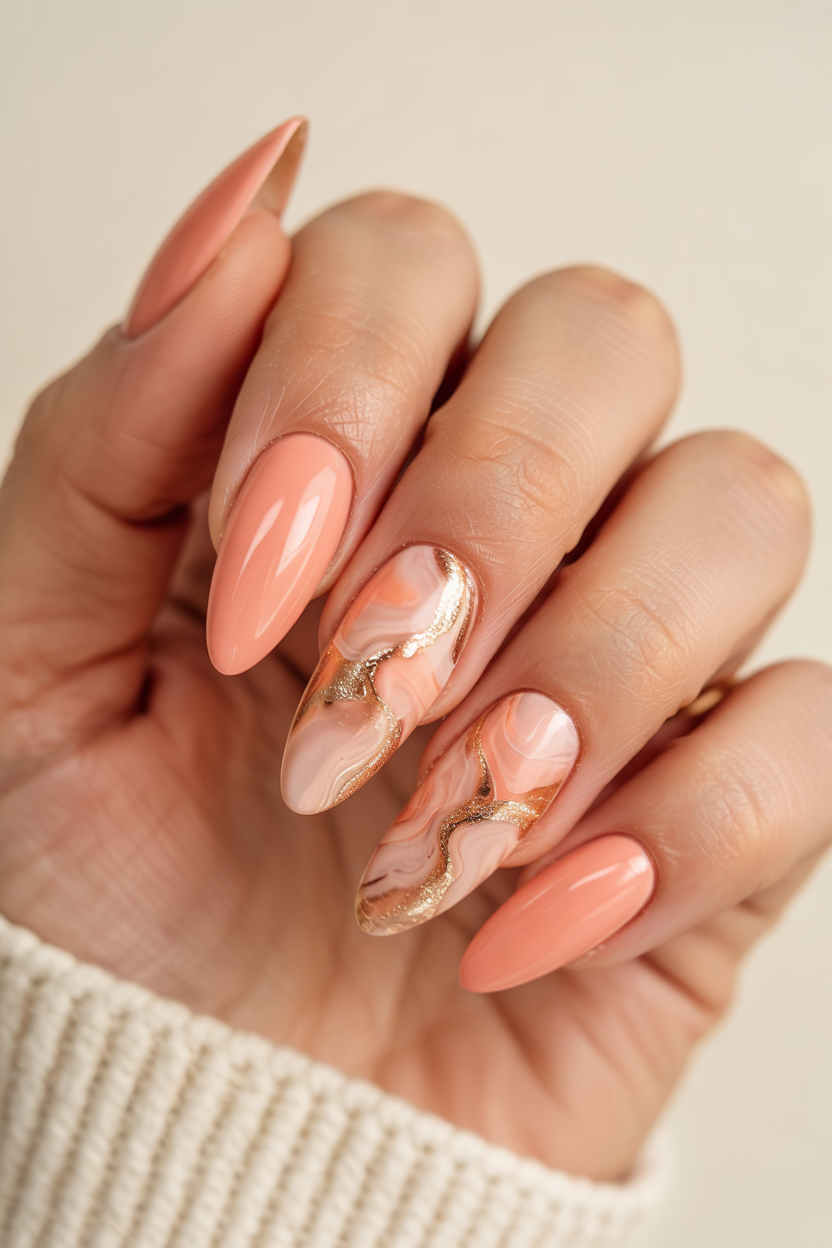This design feels artistic and refined, like wearable art on your fingertips. The peach marble effect is fluid and organic, while the gold detailing adds depth and quiet luxury. It’s expressive without being loud, perfect for women who appreciate thoughtful details.
