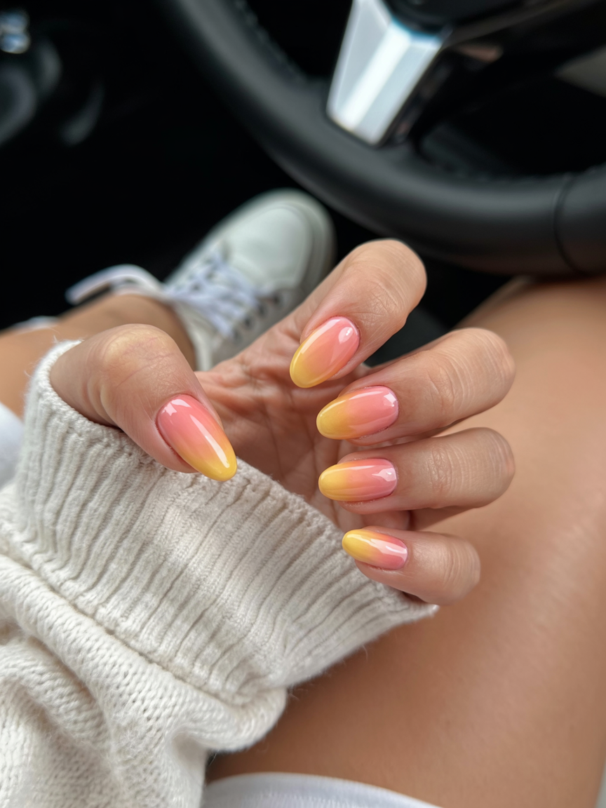 This playful blend brings a little sunshine to your fingertips. The peach base melts into a soft yellow tip, creating a cheerful, lighthearted look that feels perfect for warm days and spontaneous plans. It’s fresh, bright, and has a youthful charm without crossing into neon territory.