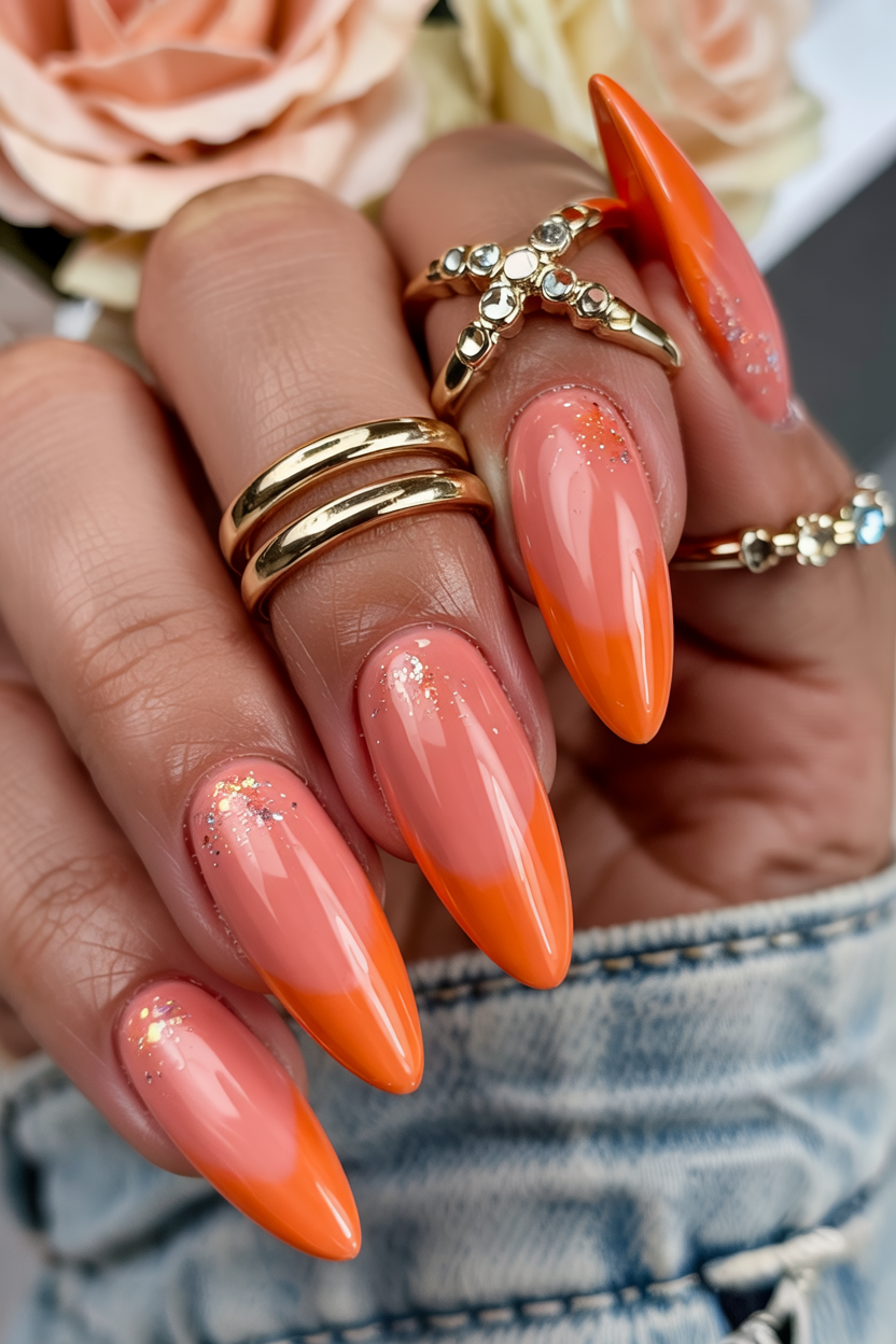 This manicure feels bold, warm, and full of personality. The peach blending into orange creates a glowing ombre effect, while the fine glitter adds a subtle sparkle that catches the light beautifully. It feels confident and joyful, perfect for making a statement.
