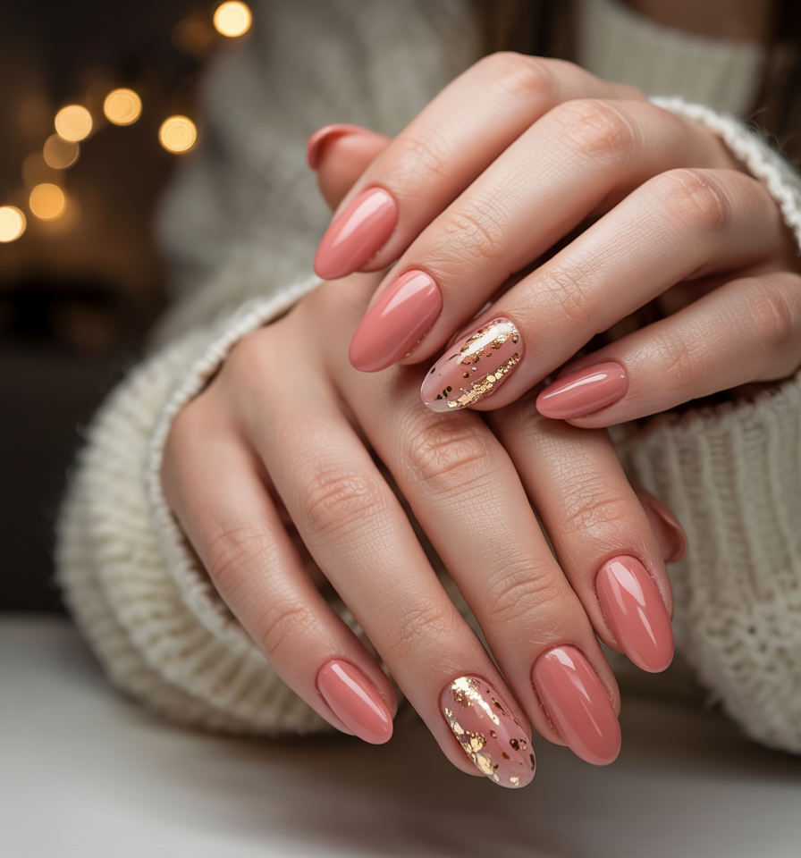 This manicure feels soft, cozy, and quietly festive. The pale peach base is gentle and calming, while the rose gold glitter nails add just enough sparkle to feel special. It has that warm, comforting mood of a favorite knit sweater paired with subtle jewelry—relaxed, feminine, and effortlessly pretty.
