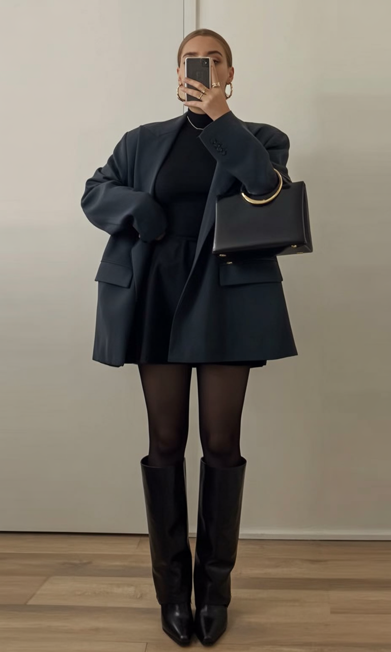 This look is all about quiet power. The full black ensemble feels sleek, strong, and seriously elevated—like you’re walking into a meeting and everyone subtly shifts in their seat. The oversized blazer softens the edge of the mini dress, while thigh-grazing boots and sheer tights give it that magnetic balance of allure and authority.