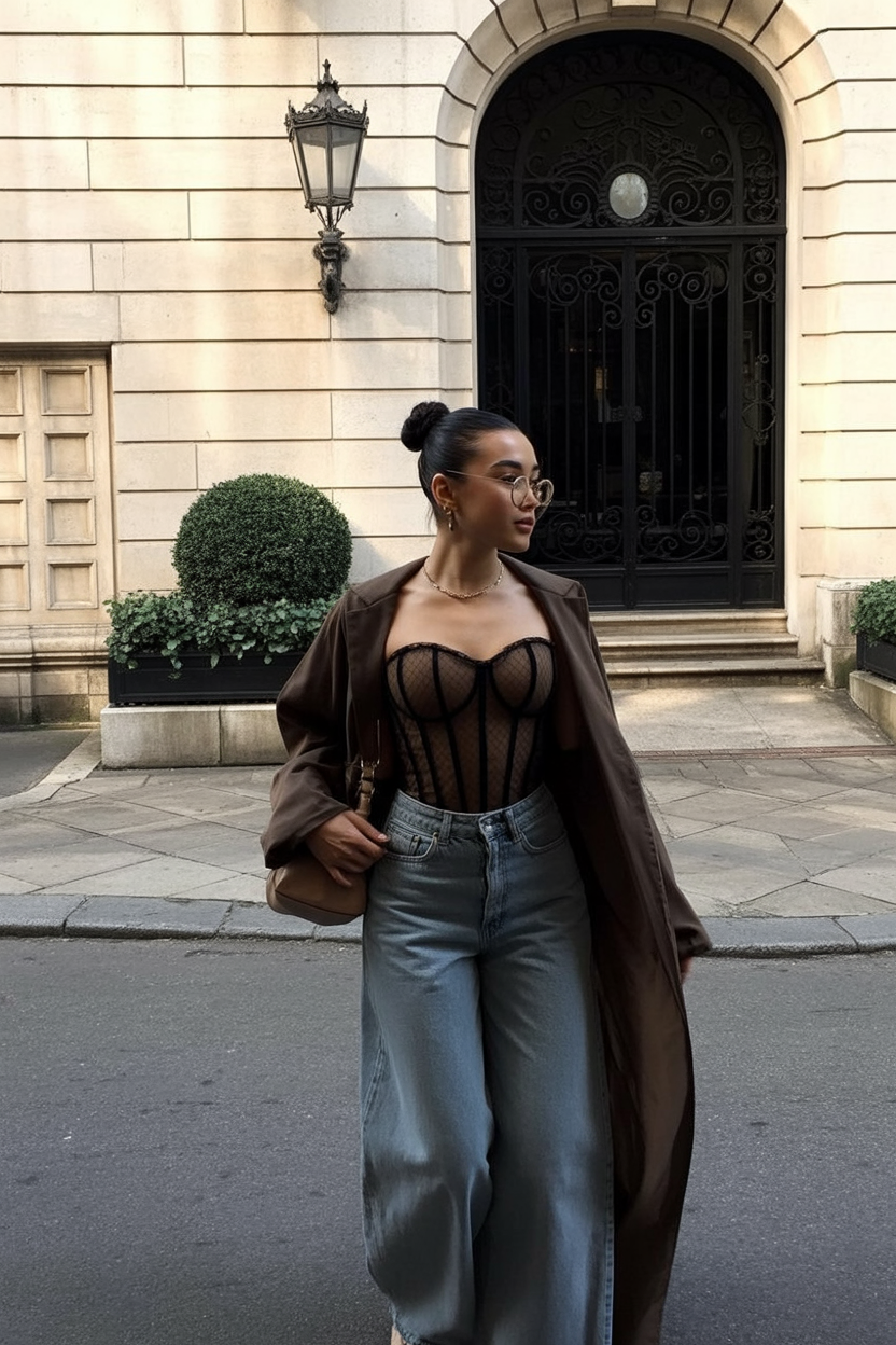 Now this is how you make a statement. A sheer corset top under a flowy brown blazer says glam with a touch of mystery. Paired with wide-leg jeans, it’s daring without being over-the-top—like an elevated version of your go-to jeans and cute top combo.