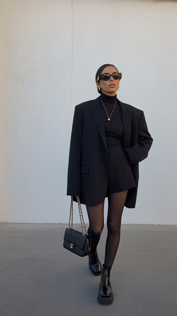 Everything about this outfit is giving timeless and untouchable. The head-to-toe black ensemble—with sheer tights, structured blazer, and tailored mini—evokes high-end Paris street style. The gold pendant and quilted bag add just enough softness to balance the commanding silhouette.