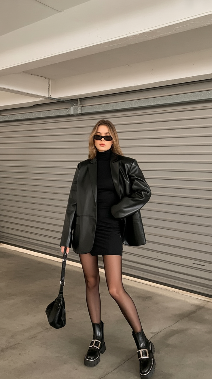 Now this is how you wear a leather blazer with attitude. The all-black base—mini dress, tights, and buckled boots—lets the glossy texture of the outerwear shine. It’s bold but balanced, thanks to the clean shapes and understated styling. A perfect mix of downtown grit and uptown glam.
