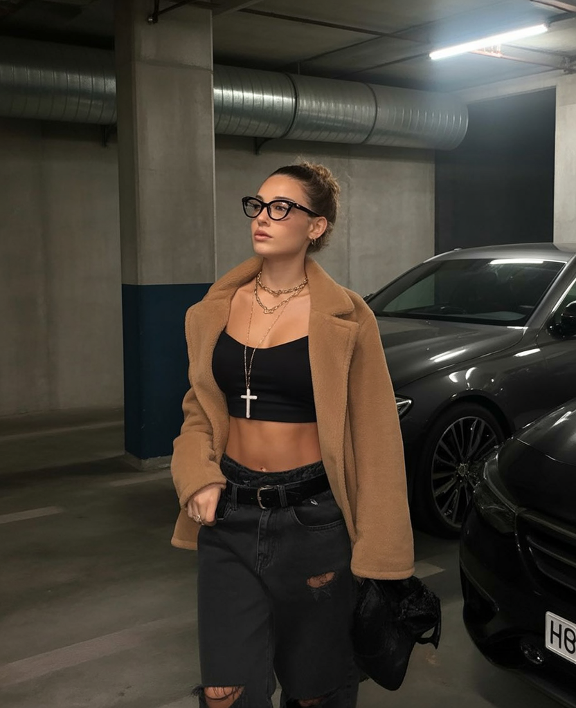 This outfit finds the perfect balance between street style and soft girl aesthetic. The cozy beige teddy coat balances out the boldness of the black crop and distressed shorts. The oversized glasses are smart-girl edgy, and the layered necklaces make it look like you’re stylishly strutting out of an indie film.