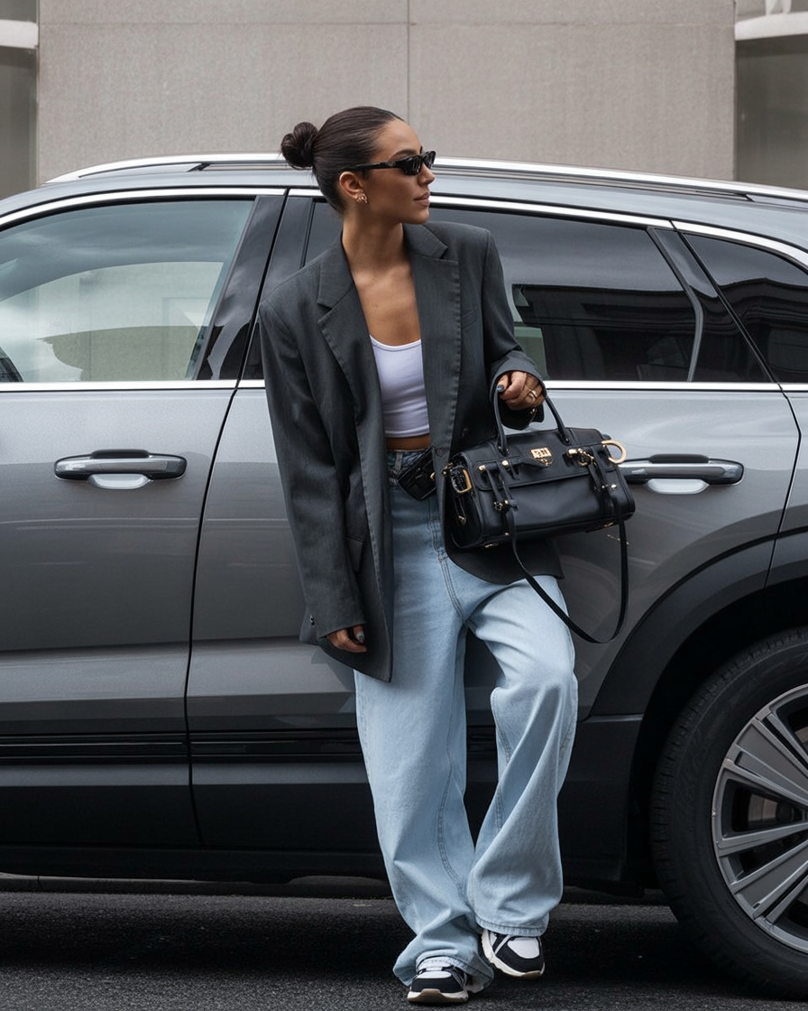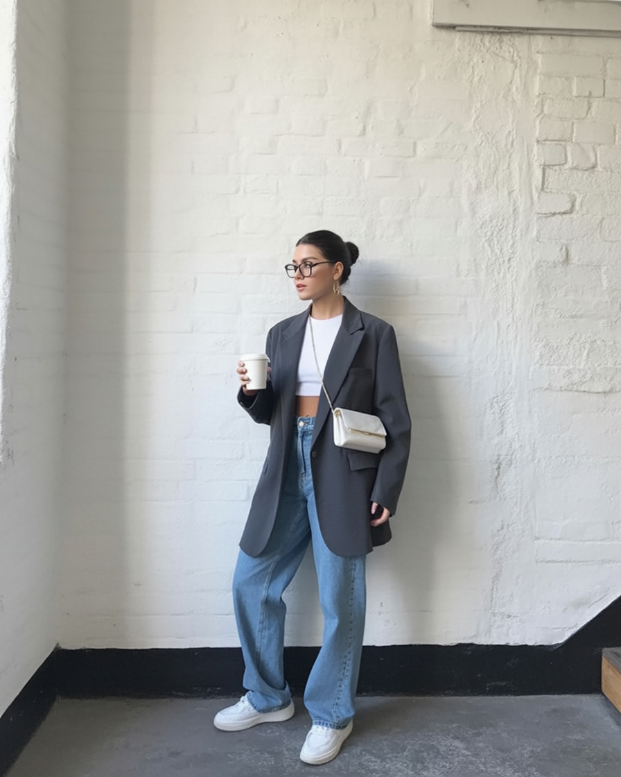 Nothing says “I’ve got this” like an oversized grey blazer paired with wide-leg denim and a cropped white top. It’s giving model-off-duty, but make it coffee-run chic. From the ponytail to the structured bag, it’s the kind of outfit that looks pulled together without even trying.