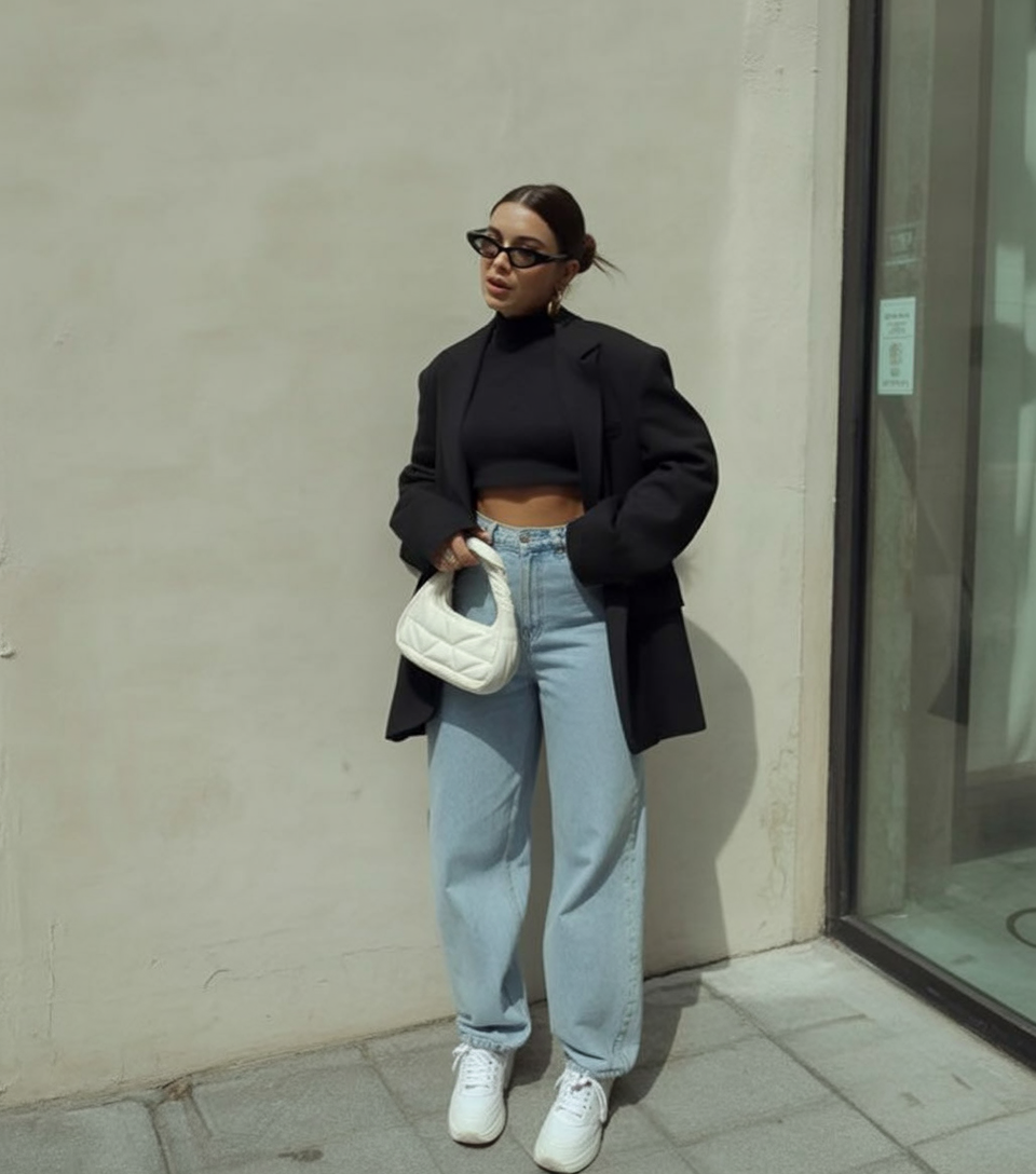 This look is a masterclass in keeping things sleek while standing out. The black cropped top and oversized blazer say “boss energy,” while the light denim and crisp white accessories soften the edge. It’s confident, clean, and just edgy enough to turn heads.
