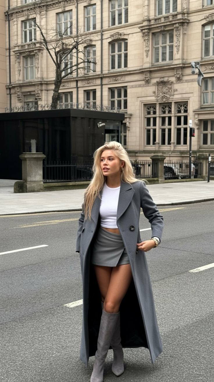There’s a kind of cinematic magic to this all-grey moment—it feels like a scene from a stylish London film. The sleek, longline coat layered over a matching mini skirt and white crop top is polished but playful. The suede boots add a rich texture that completes this monochromatic statement.