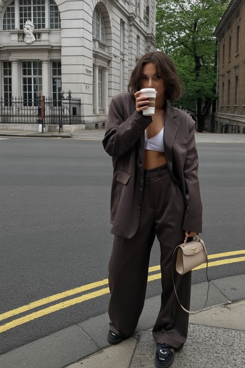 This is the pinnacle of effortless fashion. The relaxed brown blazer, paired with wide-leg matching trousers, creates a cozy elegance that screams coffee-shop cool. And to seal the deal, a white bralette is added to the mix to keep it fresh, relaxed, and uncomplicated, making the whole look feel lived-in but polished.