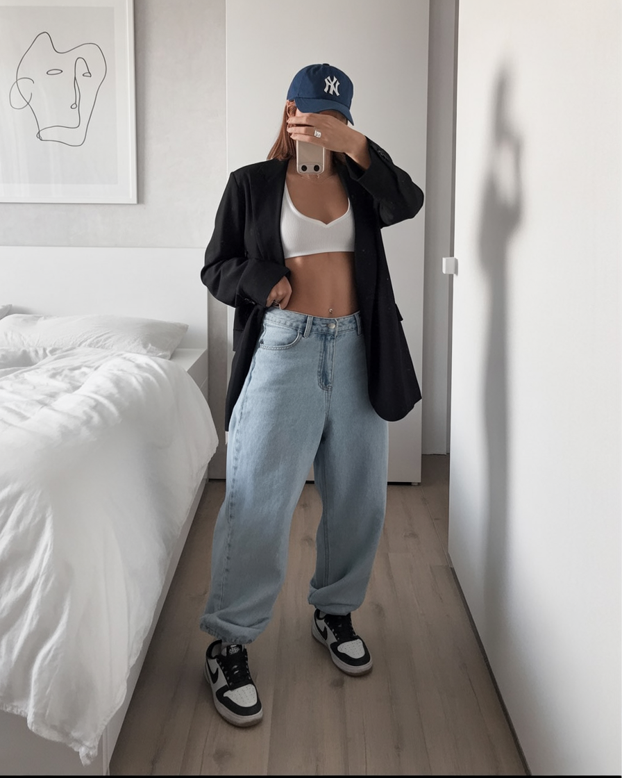 A baseball cap with a blazer? Yes, please. This outfit turns traditional styling on its head by mixing sporty energy with a tailored foundation. The black blazer over a cropped white tank and relaxed blue jeans creates a modern, casual silhouette with just the right amount of edge.