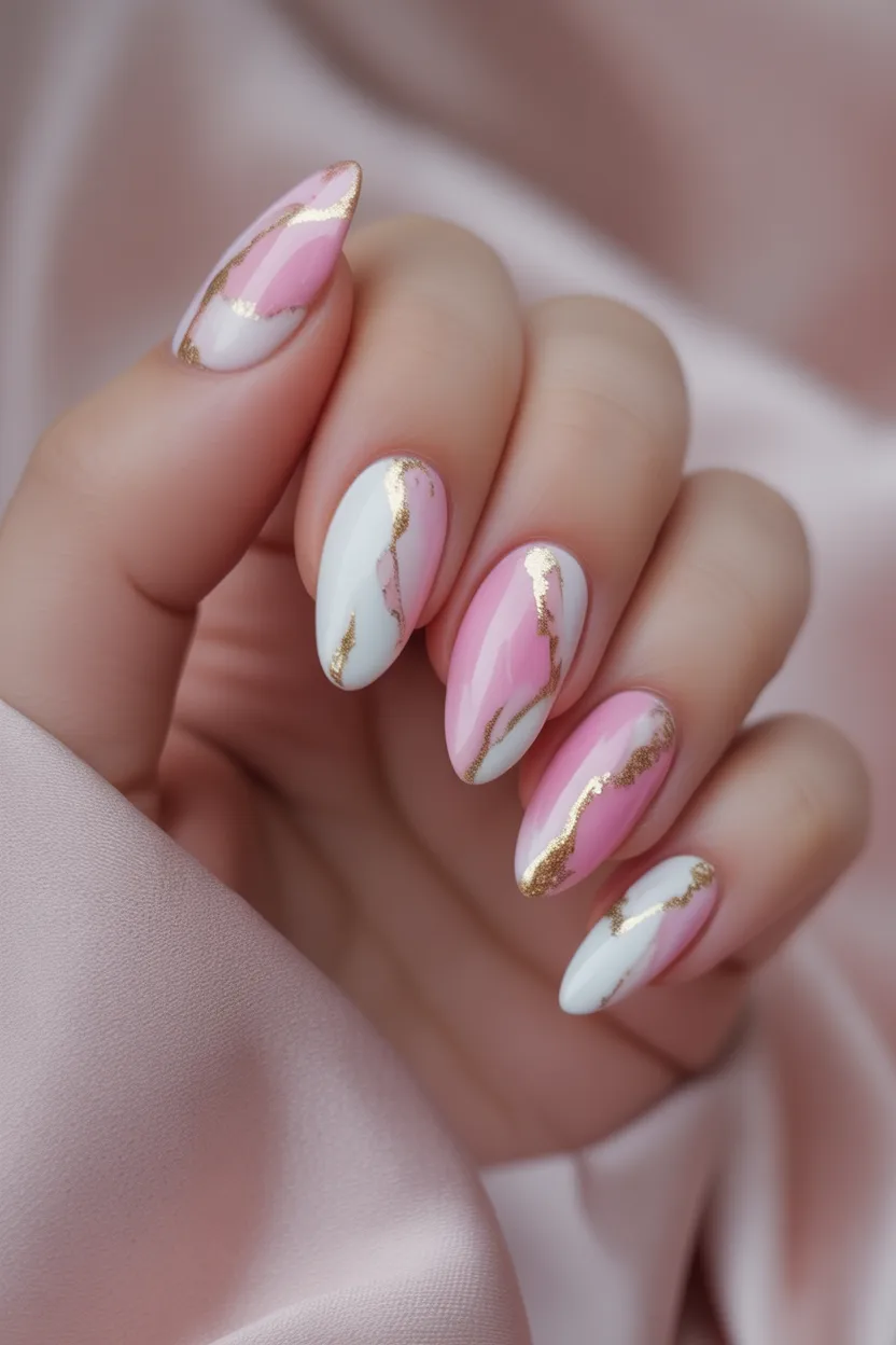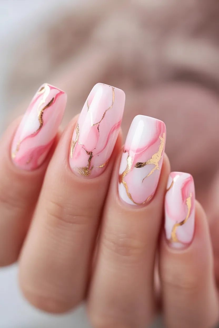 This Pink and White marble design feels soft, romantic, and quietly luxurious. The delicate gold lines flowing through the aura effect remind me of fine jewelry—subtle, but undeniably special. It’s the kind of manicure that makes you slow down for a second and admire your own hands while holding your coffee. There’s a graceful, almost bridal energy here, but it’s still modern enough for everyday wear.