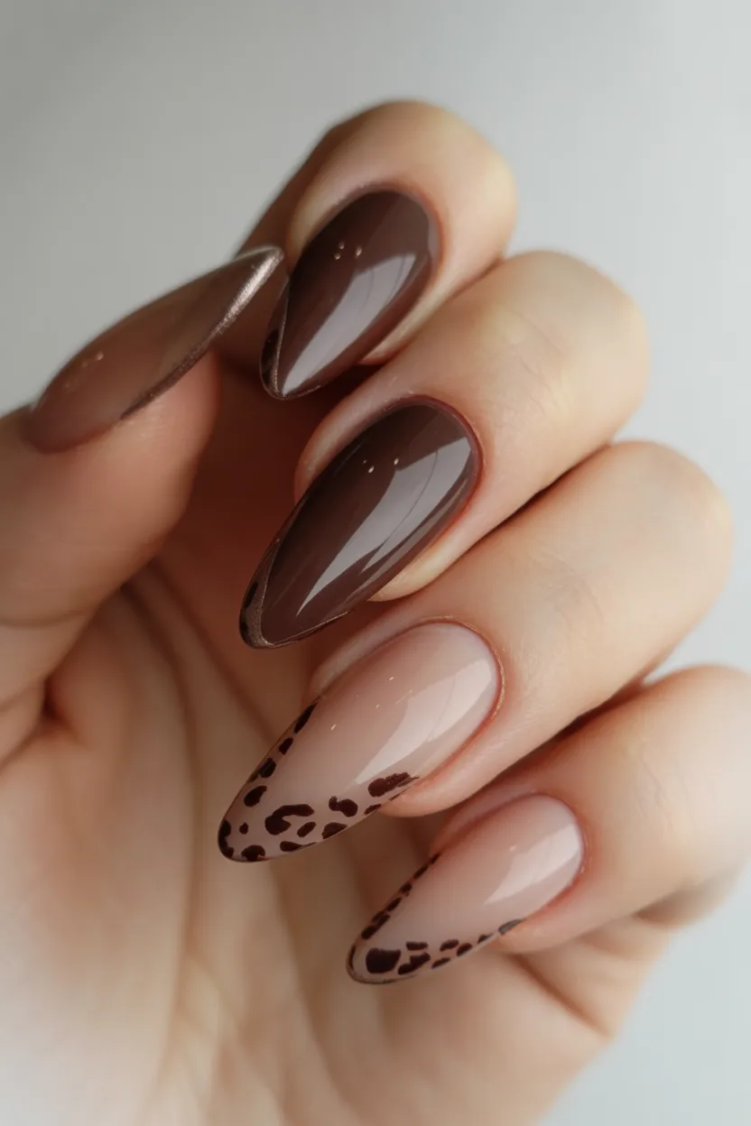 Now this one? This is for the woman who knows she still has a wild side. The rich Dark Brown aura melting into a glossy finish feels cozy and confident at the same time. Add that subtle leopard detail, and suddenly it’s not just a manicure—it’s a little attitude. It’s bold without screaming, and honestly, it pairs beautifully with your favorite Black blazer or chunky sweater.