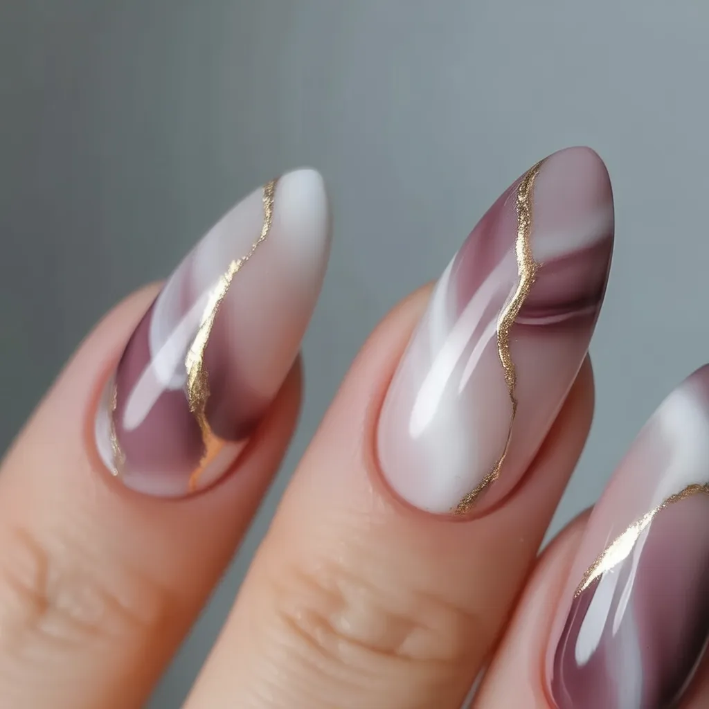 This mauve-toned aura melting into creamy White feels sophisticated in the most effortless way. The fine gold lines flowing through the design give it that modern marble vibe, almost like wearable art. It’s soft yet striking—the kind of manicure that makes you feel put together even if you’re just in jeans and a tee. There’s a quiet luxury energy here that I absolutely love.