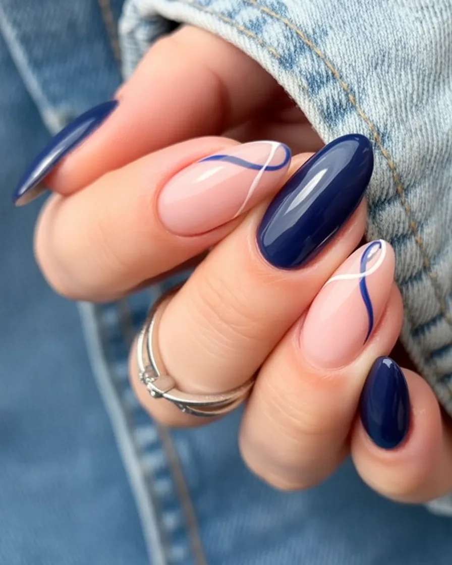 There’s something incredibly chic about deep Navy paired with a sheer base. It feels crisp and tailored, almost like your favorite structured blazer—but with a feminine twist. The soft wave detail keeps it from feeling too serious, adding just enough movement to make the design modern and interesting. It’s the kind of manicure that whispers confidence instead of shouting for attention.