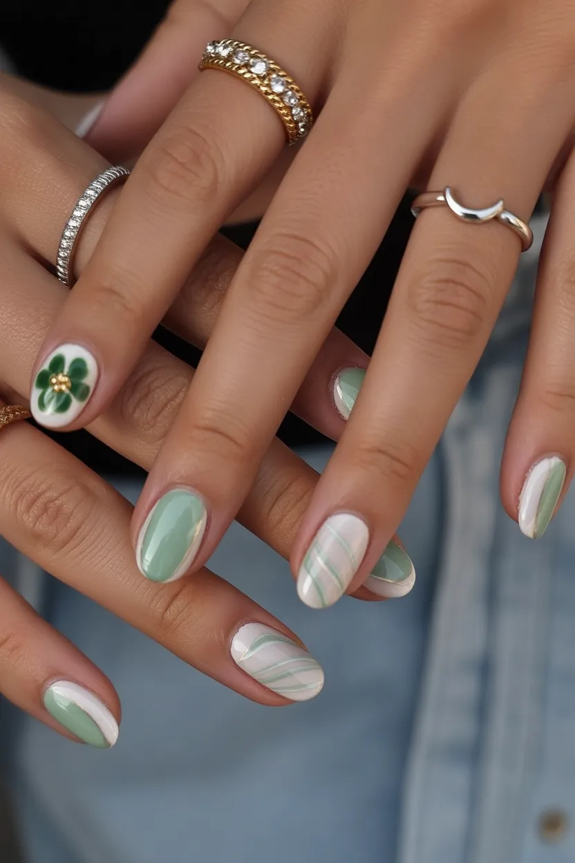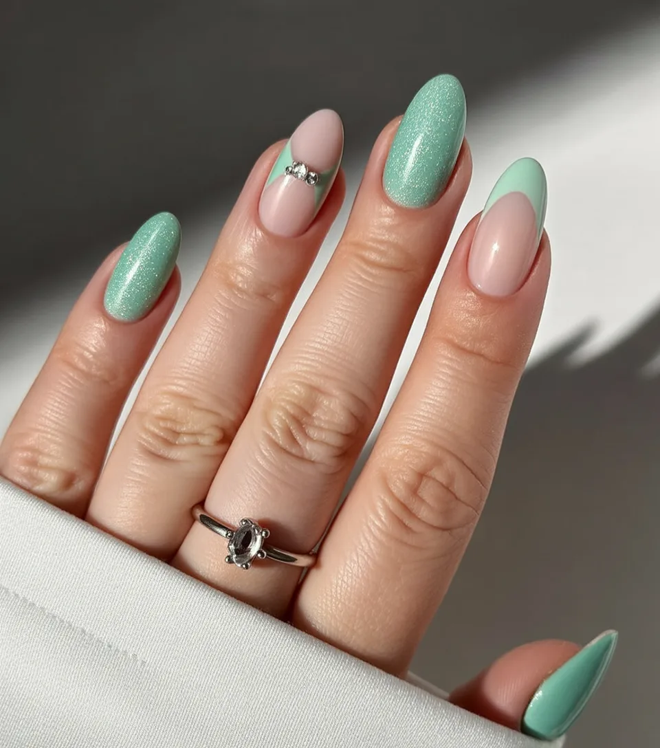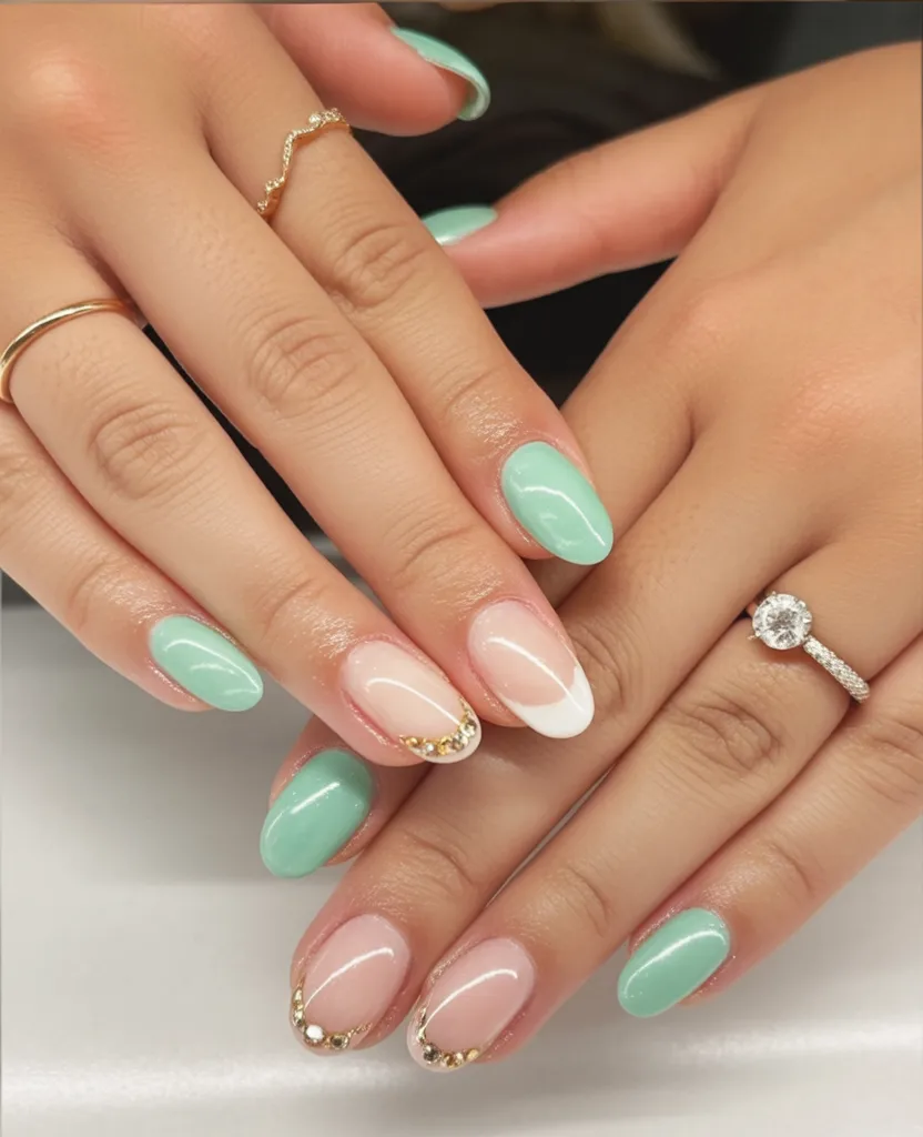 If you’re someone who loves low-maintenance manicures, this design is surprisingly forgiving as it grows out. The soft neutral base blends beautifully with your natural nail, while the pop of Green keeps things lively for Spring or Summer. Add dainty gold jewelry, and you’ve got a look that feels effortless and put together.