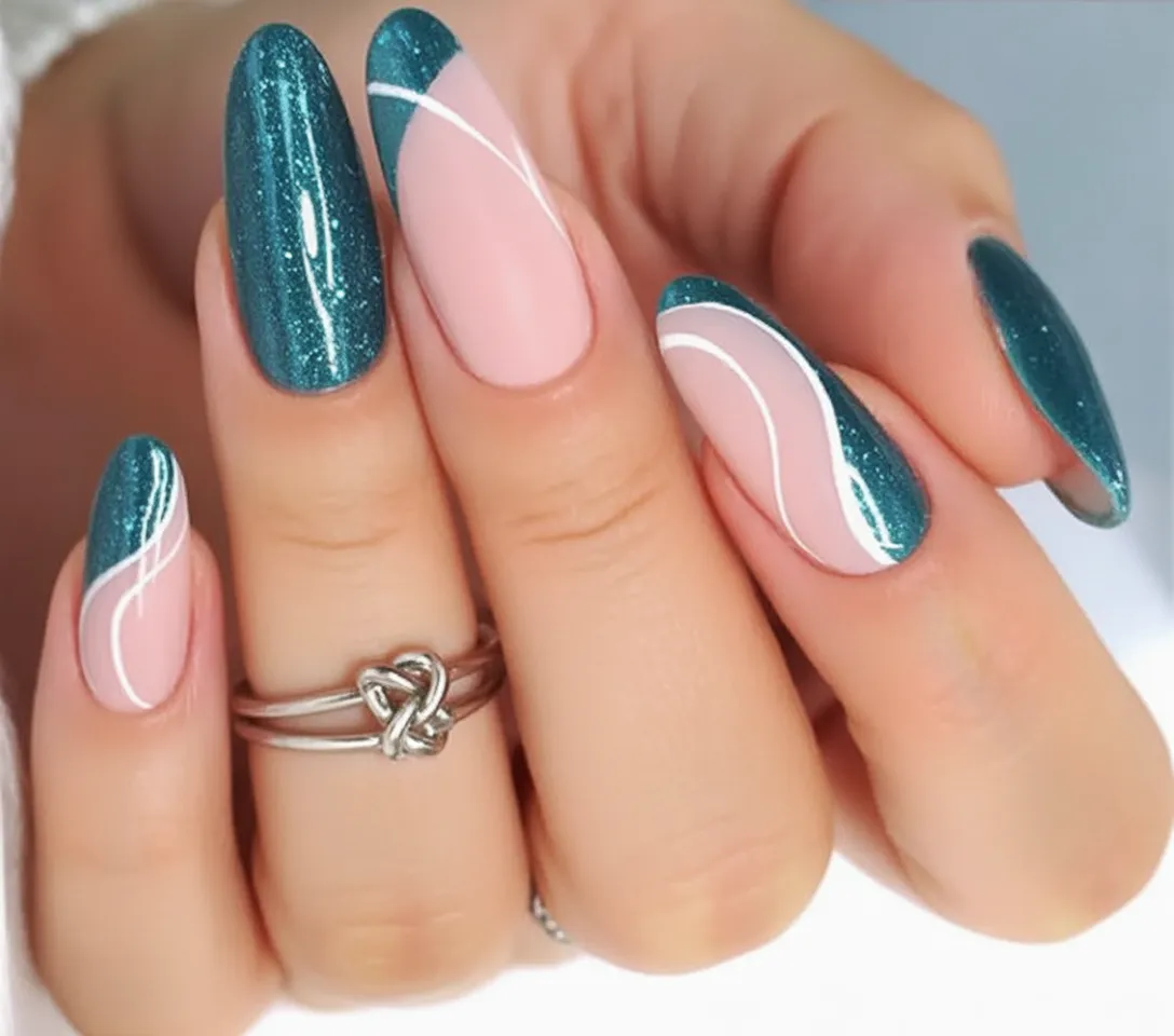 There’s something about this shimmering Green that just makes you smile. It has that soft, sparkling finish that catches the light beautifully without feeling flashy. The Almond shape adds elegance, while the subtle nude base keeps the overall vibe balanced and wearable. It’s playful but still polished.