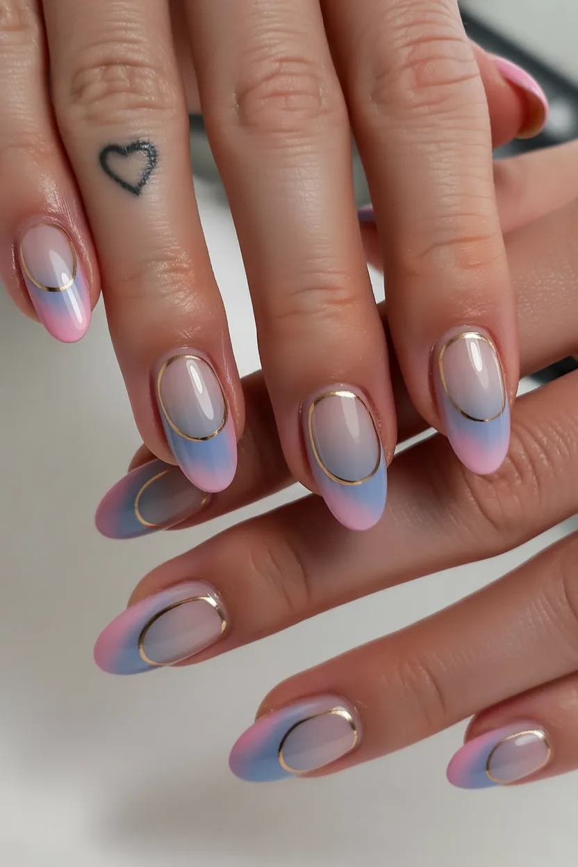 If you’ve ever wanted your nails to look like a soft sunrise, this is it. The gentle fade from Blue to Pink creates that airy, almost watercolor effect that feels fresh and uplifting. The thin gold outline framing each nail gives structure to the softness, making the whole look feel intentional and elevated rather than overly sweet.