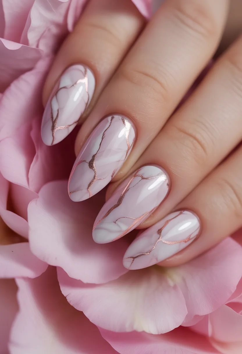 This soft Nude base swirled with delicate rose-gold lines feels effortlessly elegant. It’s subtle, refined, and incredibly wearable—the kind of manicure that works with everything in your closet. The flowing marble effect gives it dimension, while the warm metallic detail adds just enough glow to make it feel special.