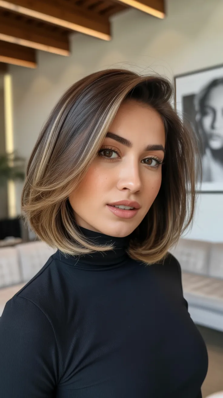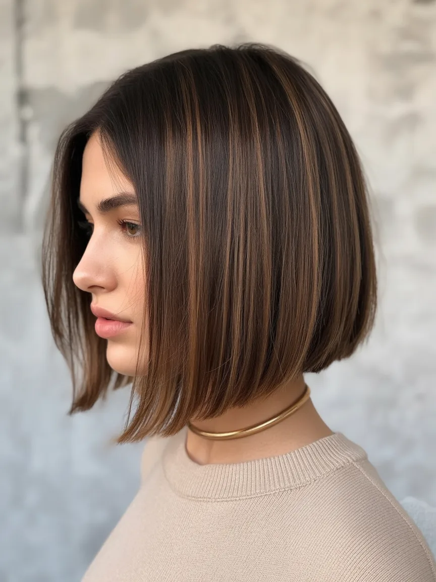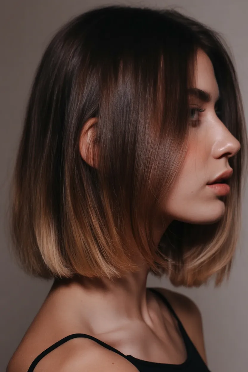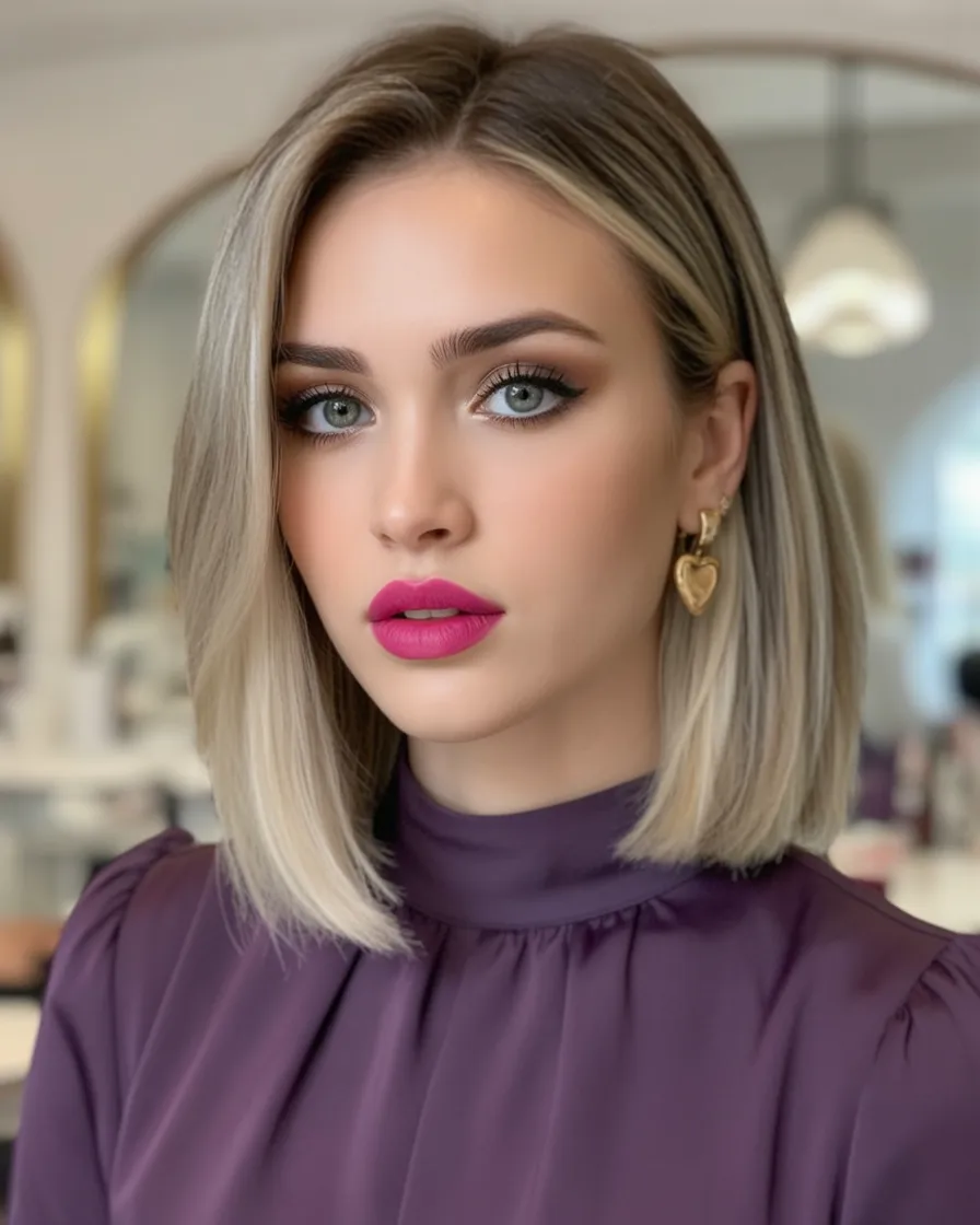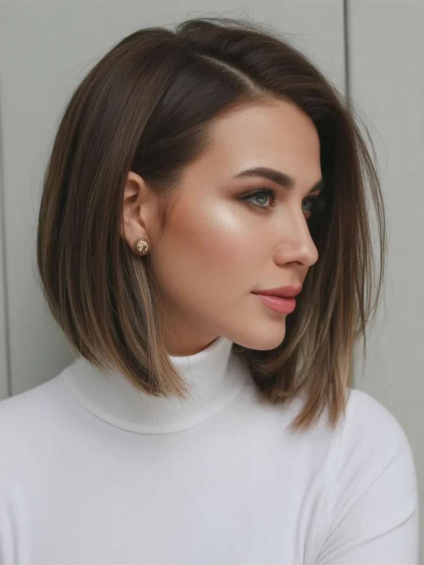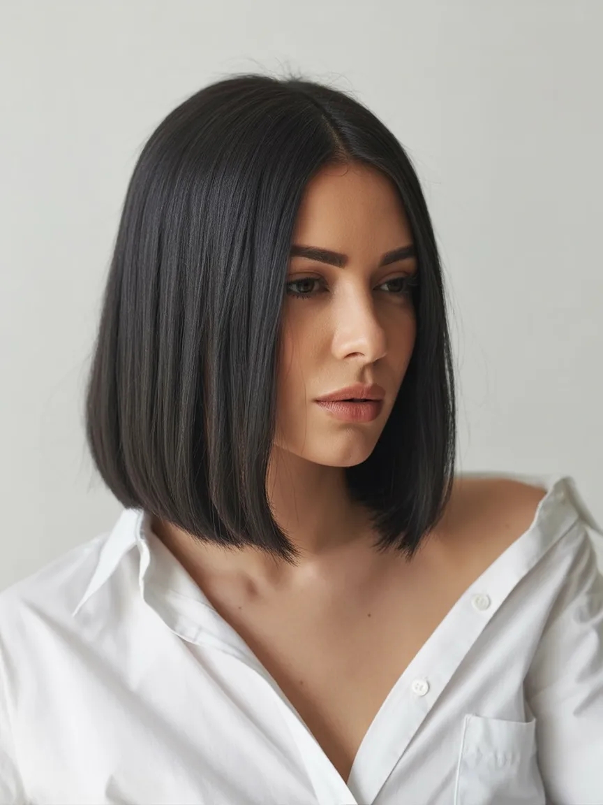 There’s something incredibly polished about a sleek Angled bob like this. The smooth surface and gently curved lines create a refined silhouette that feels elegant yet modern. It’s the kind of hairstyle that instantly elevates a simple outfit and adds a quiet touch of sophistication.