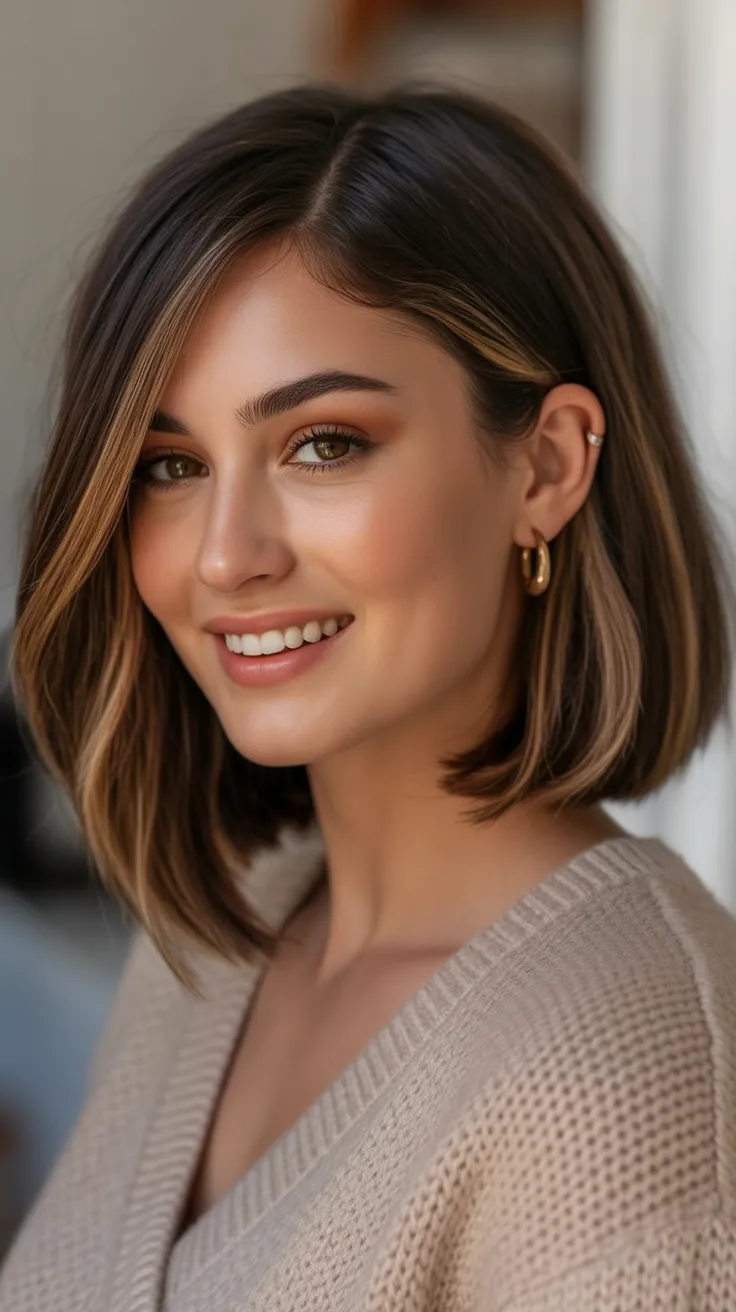An Angled Medium bob like this is especially flattering for women with a Round face because the longer front sections help visually elongate the face. With a smoothing serum and a quick blow-dry, the sleek shape stays polished while still feeling light and comfortable for everyday wear.