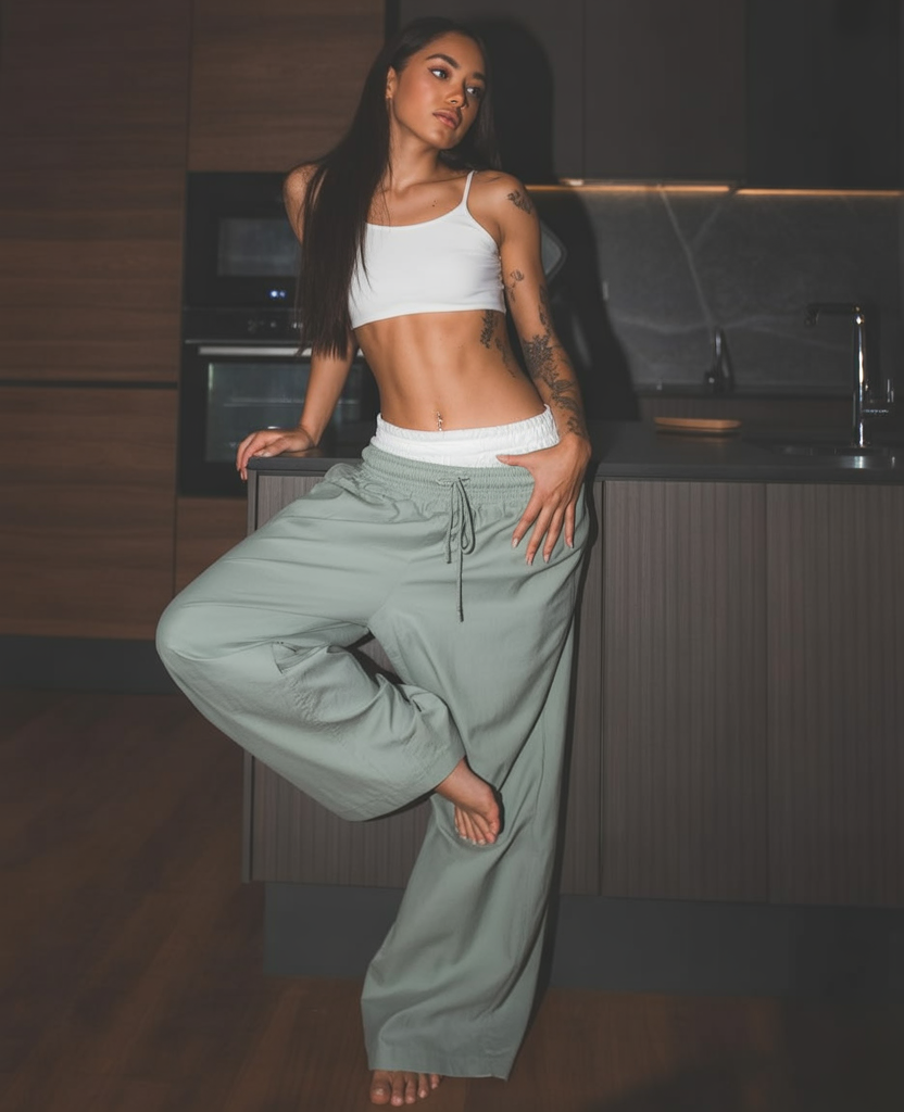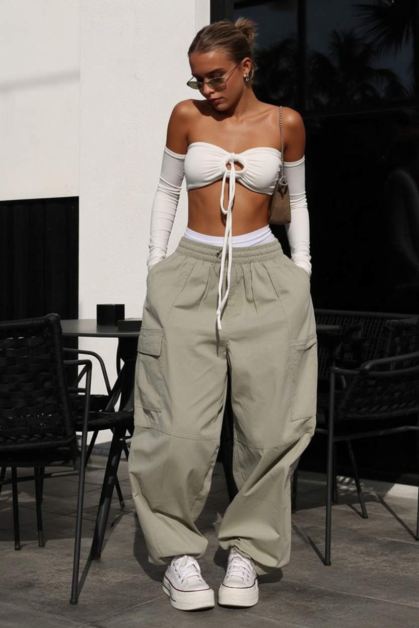 If you’re the kind of girl who wants to feel like she’s wearing pajamas but still look ready for a photo op—this is the outfit. The sage green drawstring pants flow like a dream, while the white crop top keeps it simple and sexy. It’s giving lounge goddess who accidentally stole the spotlight.