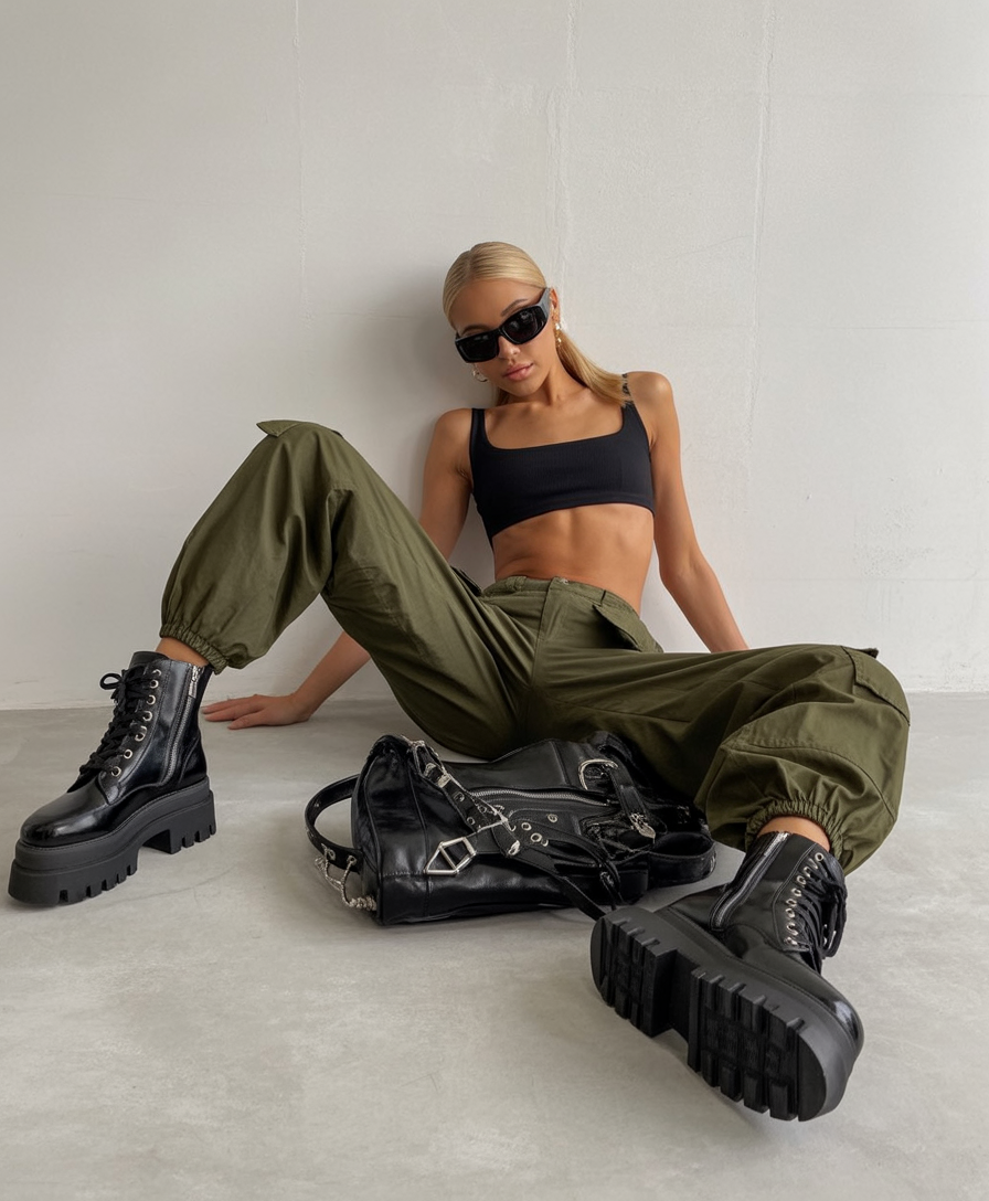 With slick shades and stomp-worthy boots, this outfit is the ultimate power statement for the modern alternative rock goddess. The army green cargos and black crop top scream confidence and don’t-give-a-damn energy. It’s part streetwear, part military baddie, and 100% ready for action—whether that’s moshing or just owning the sidewalk.