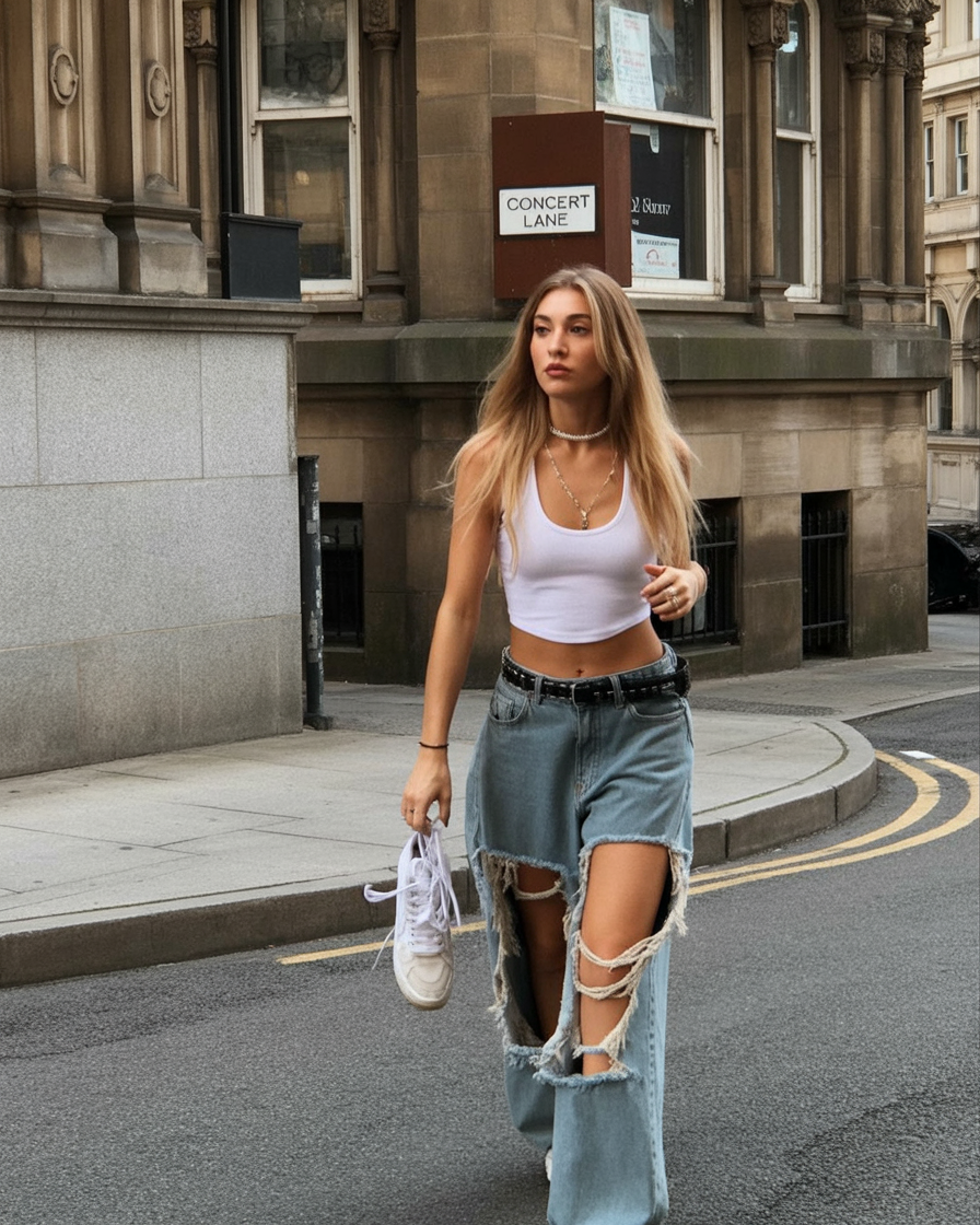 This ripped-denim fantasy brings the 2000s back with a vengeance—and we’re living for it. With slashes so bold they double as ventilation, this look mixes don’t-care energy with flirty festival freedom. The cropped tank is fresh and fitted, giving balance to the chaotic, artfully destroyed jeans. Think: Blackpink meets late-night city concerts.