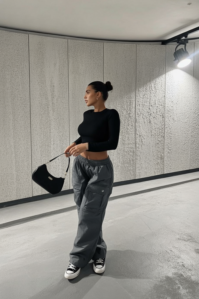 Minimalist with an edge, this black crop top and gray jogger pairing is one of those combos that always works. Sleek hair and an on-trend mini bag elevate it from casual to elevated, and the Converse-like sneakers keep it grounded. The whole look gives “cool girl in the hallway before the headline act” energy.