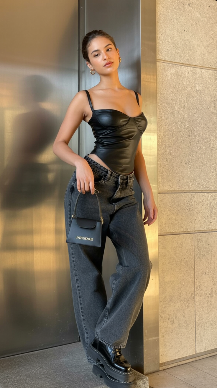 It suits hourglass or rectangle body types and adds visual length thanks to the vertical details. The corset cinches the waist, while the wide-leg jeans allow movement. Whether you’re headed to an alternative rock gig or just sipping cocktails in the crowd, this look brings the perfect mix of structure and cool.