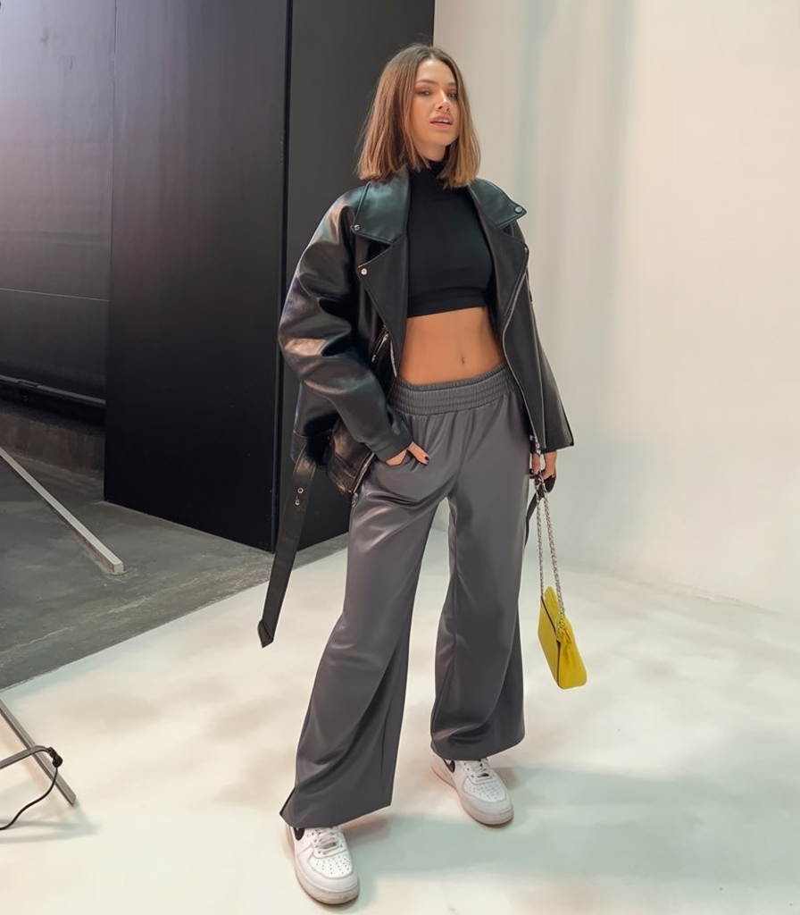 Nothing says “ready for the afterparty” like this mix of street and sleek. The cropped turtleneck adds just the right amount of mystery, while the wide-leg pants and oversized leather jacket bring in the kind of 90s confidence we’ve been craving. Bonus points for that yellow handbag—a little splash of sunshine in a stormy palette.