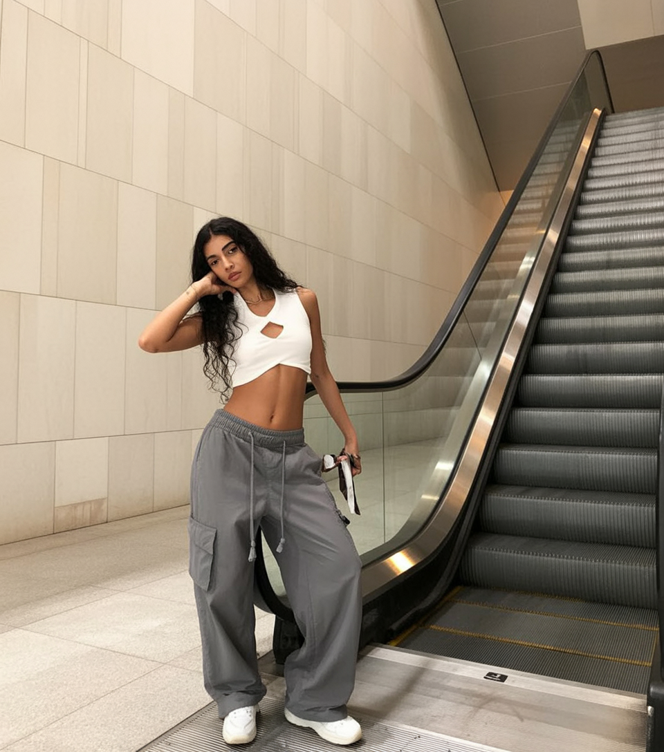 This outfit is the definition of “cool without trying.” The charcoal sports bra and oversized cargos feel like a nod to gym-to-gig chic, while the combat boots and tied jacket around the waist add urban grit. It’s understated, unfussy, and wildly confident—perfect for a night that turns into morning.