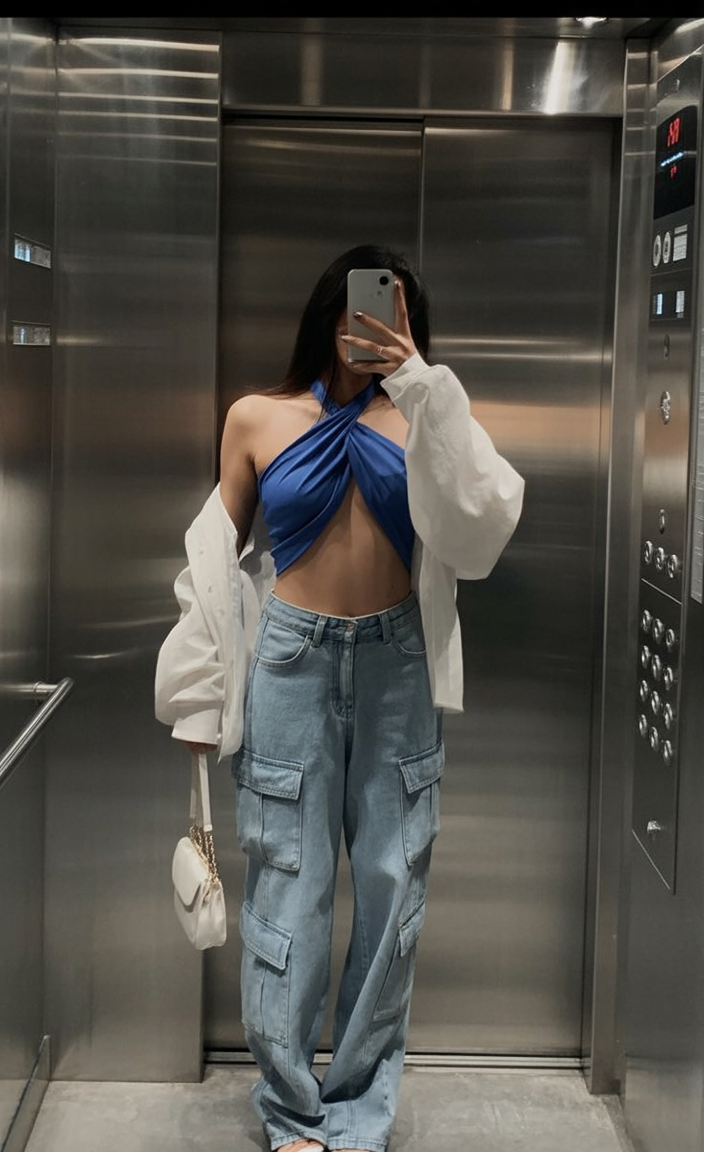 Bold and unexpected, this look makes elevators feel like catwalks. The twist halter top in electric blue is daring but refined, and the relaxed cargo jeans make it wearable. Add a slouchy white shirt for just the right level of casual mystery. This is the kind of outfit that says, “You never know where the night will take you.”