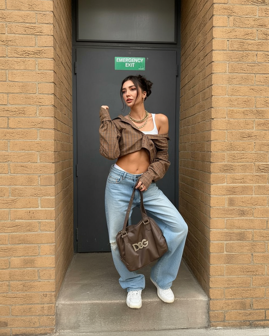 This outfit is what happens when cozy flannel grows up and goes glam. The layered look—with a twisty cropped shirt, white tank, and baggy jeans—is playful but intentional. The Dolce & Gabbana tote adds that high-low contrast we love, and the whole vibe screams country meets city baddie.
