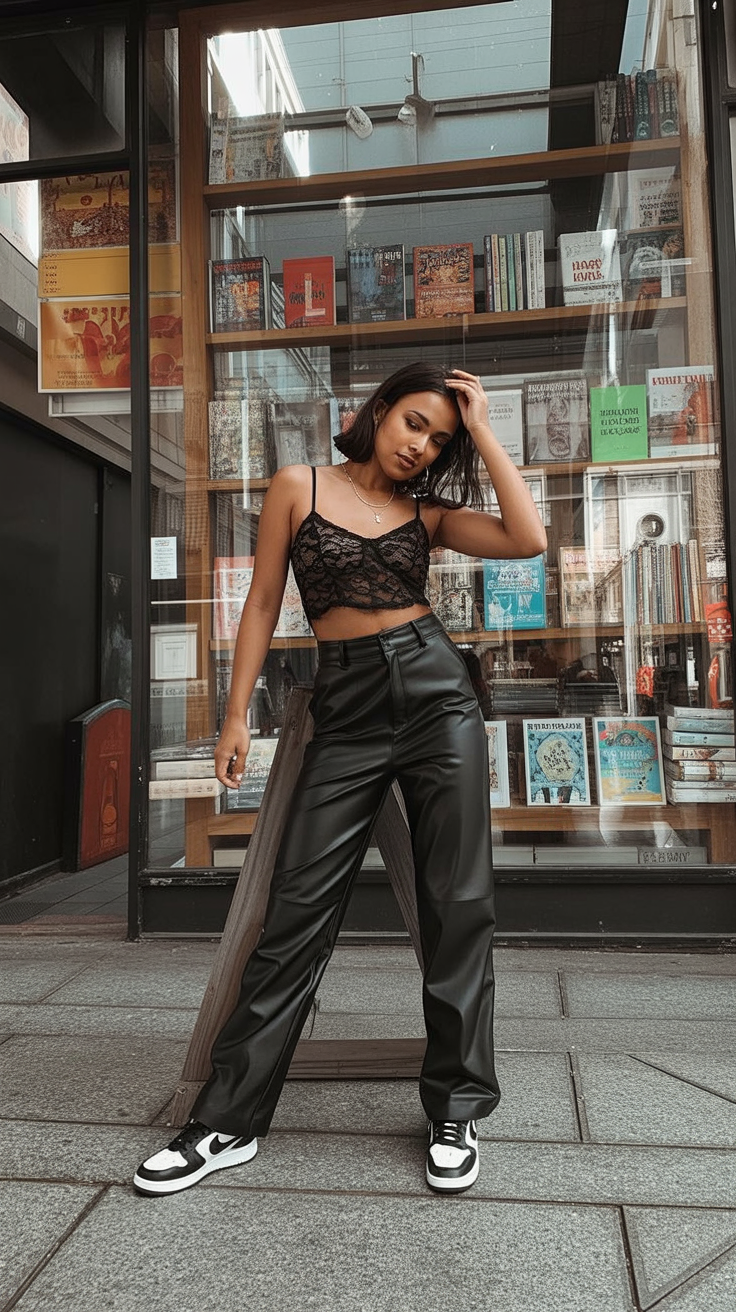 There’s something wildly seductive about mixing delicate lace with structured faux leather. The cropped lace cami softens the strong silhouette of the pants, making this look both sultry and strong. It’s perfect for a concert where you might flirt, dance, or make unforgettable memories under neon lights.
