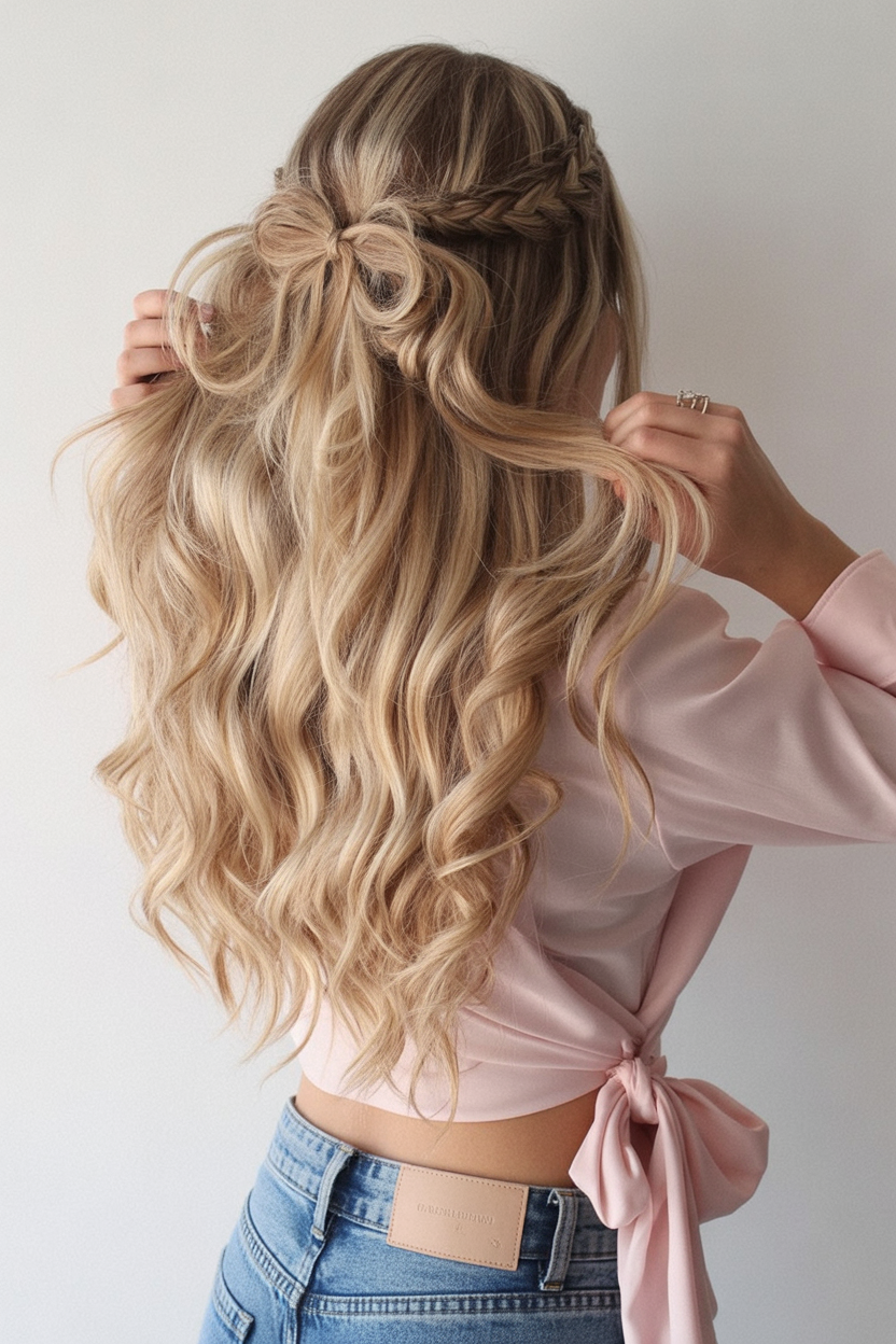 The style will suit long hair that has some texture or slight wave. Curl with the ends of the hair first, and then to make the mini bow, loop using two strands of hair and secure with bobby pins. It is among the cutest school, workplace, or even an informal Galentine gathering ideas.