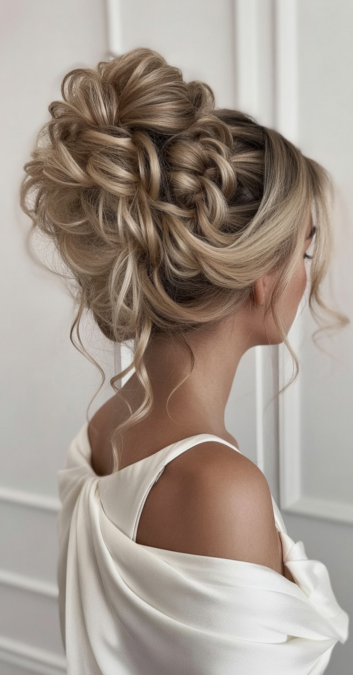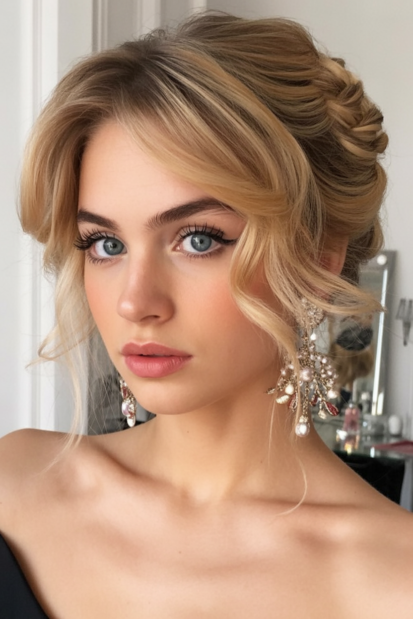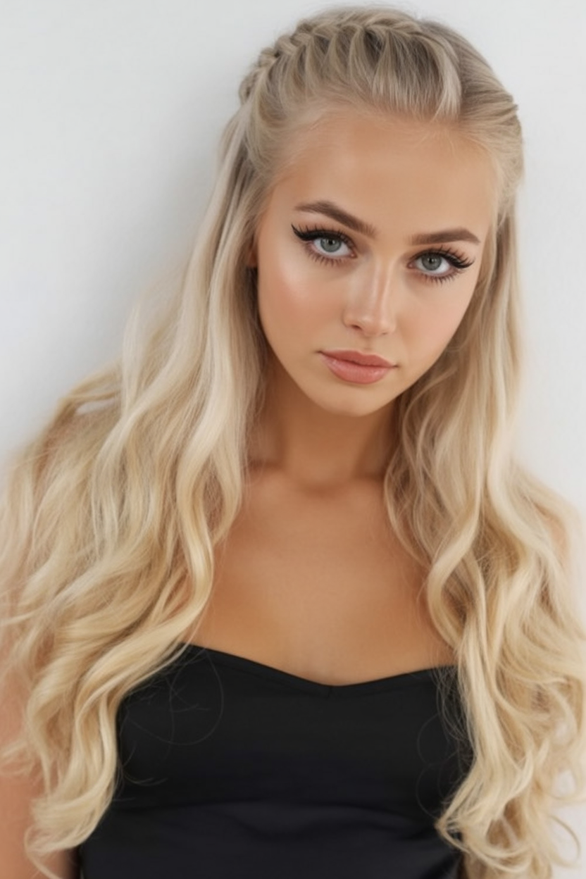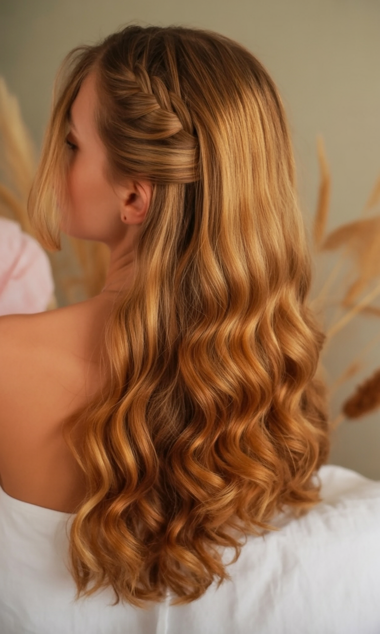 This is how something walked out of a fairytale of modern age. It can be seen how the soft halo braid weaves around the head like fine ribbon of gold and the face-framing curls are so flirtatious that they make the look feel special. This has got an air of casualness and gentleness about it- as though you are stepping out to a valentine brunch with champagne and giggles. It’s playful but grown-up, pretty without trying too hard.