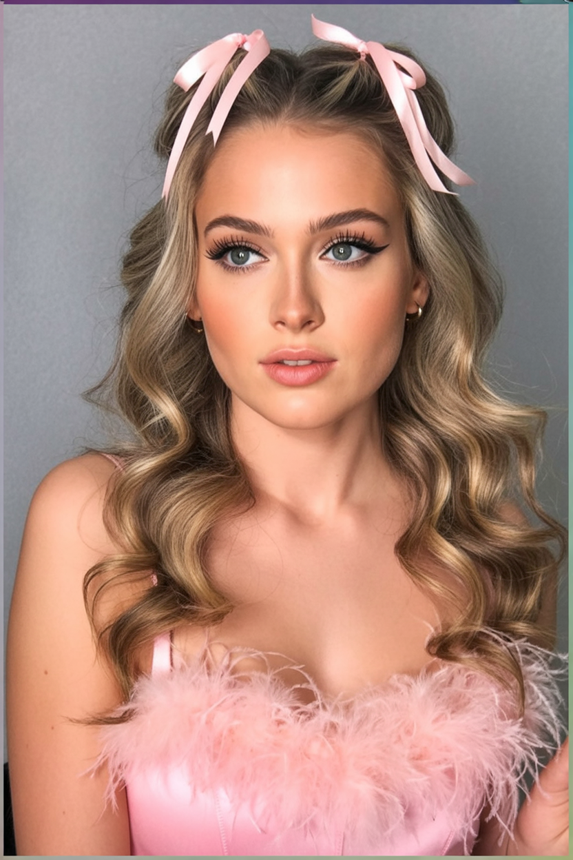 Although it may sound like a hairstyle created by Cupid himself, this soft and glossy curled hair with a touch of suave pastel ribbons accompanies nothing but the feeling of a love-struck world. It has got something old-fashioned about it as well, a bit of old-Hollywood reminiscent brought to 2025 with a hint of fun and seduction.