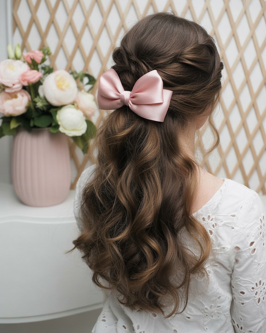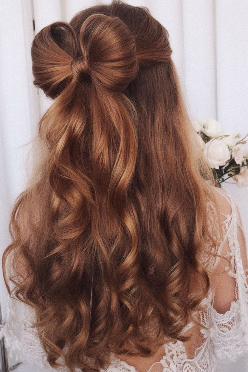 The feminine factor of feminine charm is brought to the fore when there is a soft pink bow pinned into urgent locks that are casually flowing. This up-do is classic enough to transport you to a garden party on Valentine s Day – elegant, refined, and evergreen. The touching side twists add small depth to it and the bow ties it in a knot.