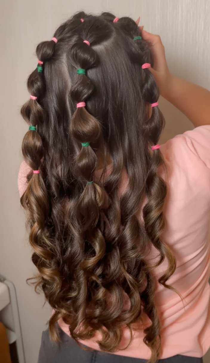This style is best suited with long hair or on children who take it particularly well in thick or curly hair. To achieve the bubble effect, use small elastics to separate your hair into those parts and to create curls, use a curling wand or foam rollers. It is one of those easy simple ideas that creates a lot of visual interest without salon level effort.